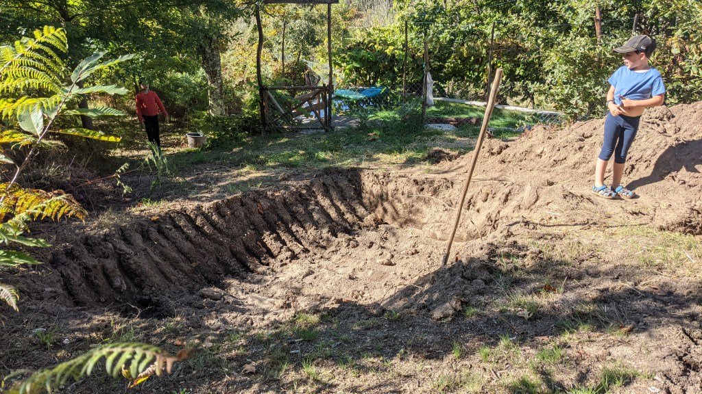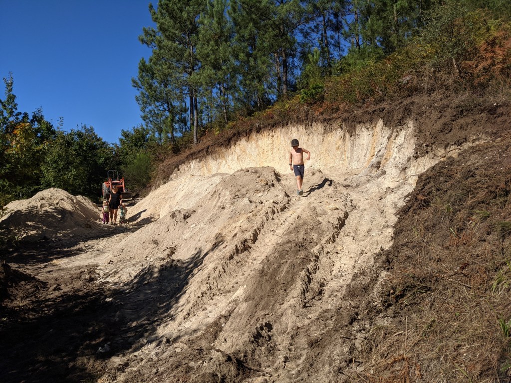 Since we needed to hire an excavator in order to dig out the ponds, we also used his services in order to dig into the slope at the back of our land, in order to harvest sand for the cob building, and to make space for a future cob workshop. The soil that was dug out for the pond was relatively rich top soil, which we then used for the adjacent Hugel bed.