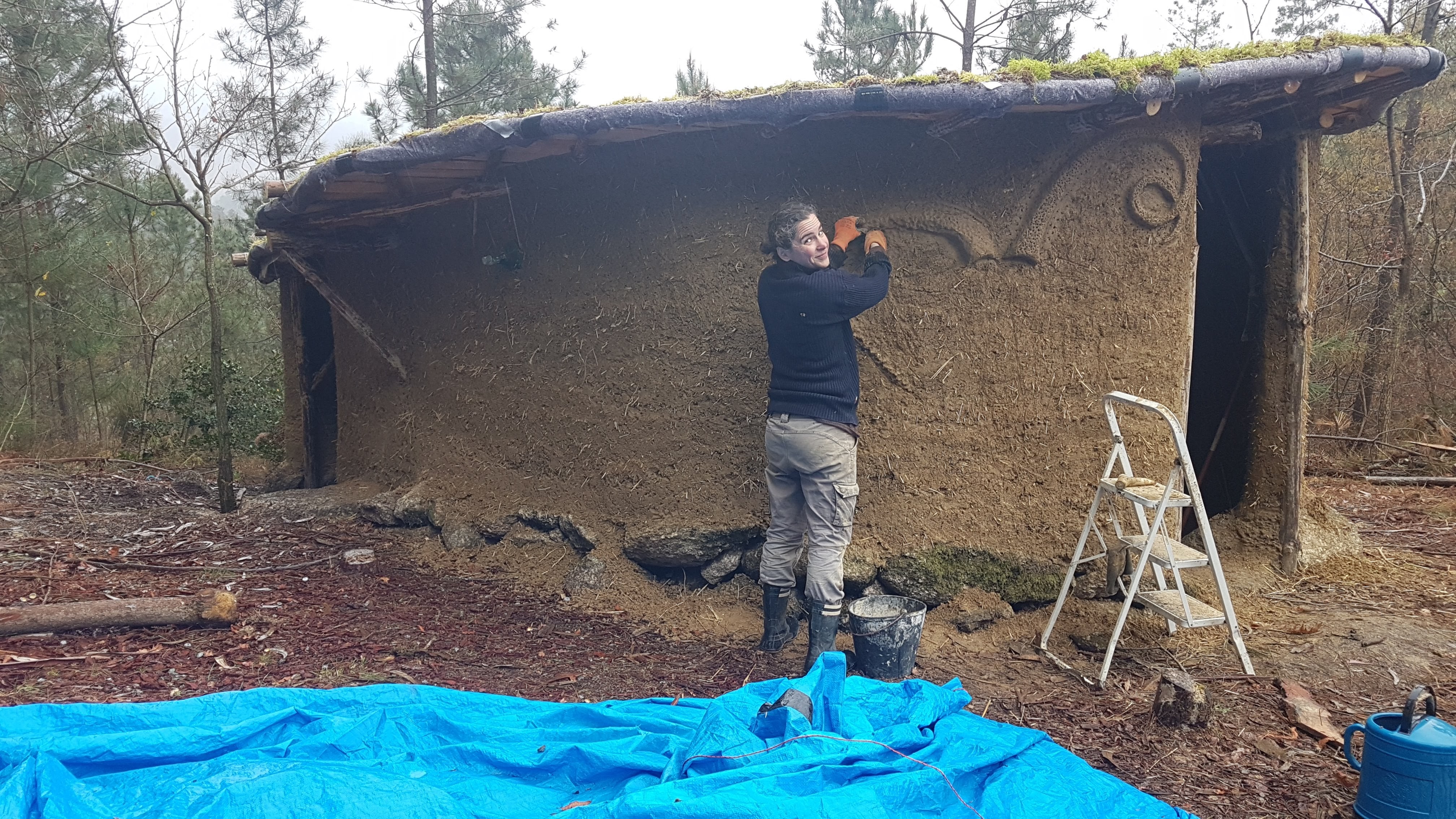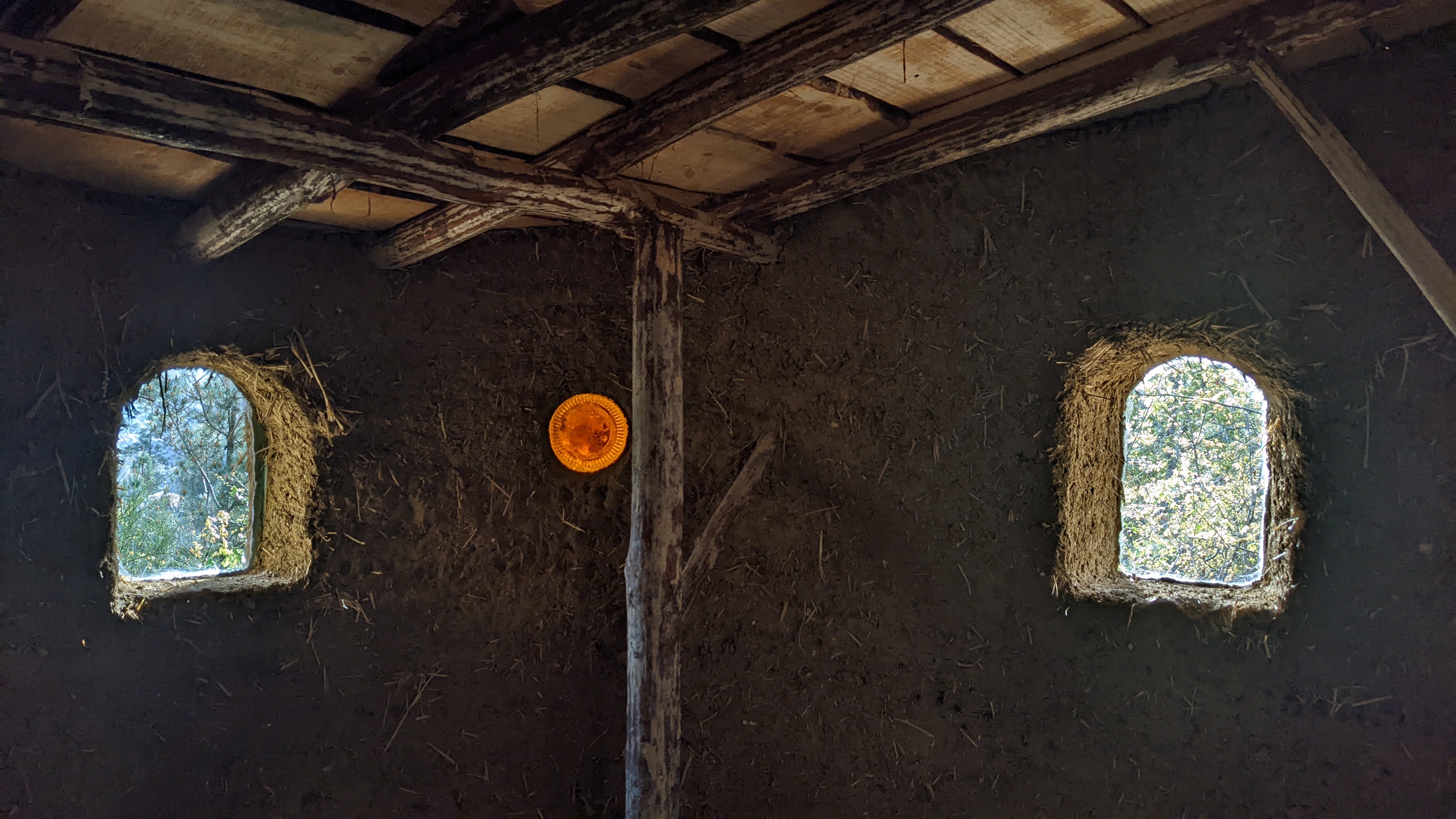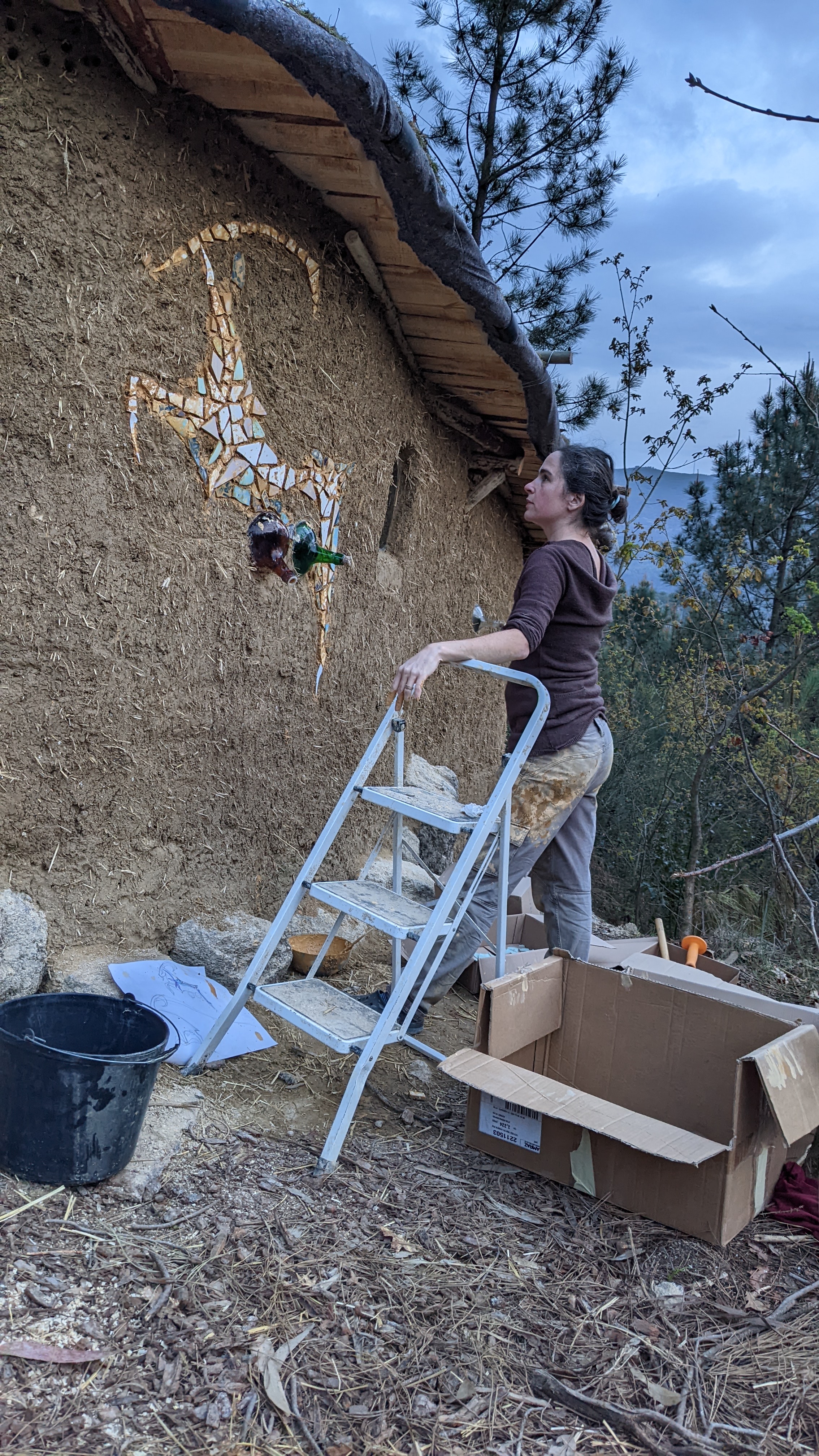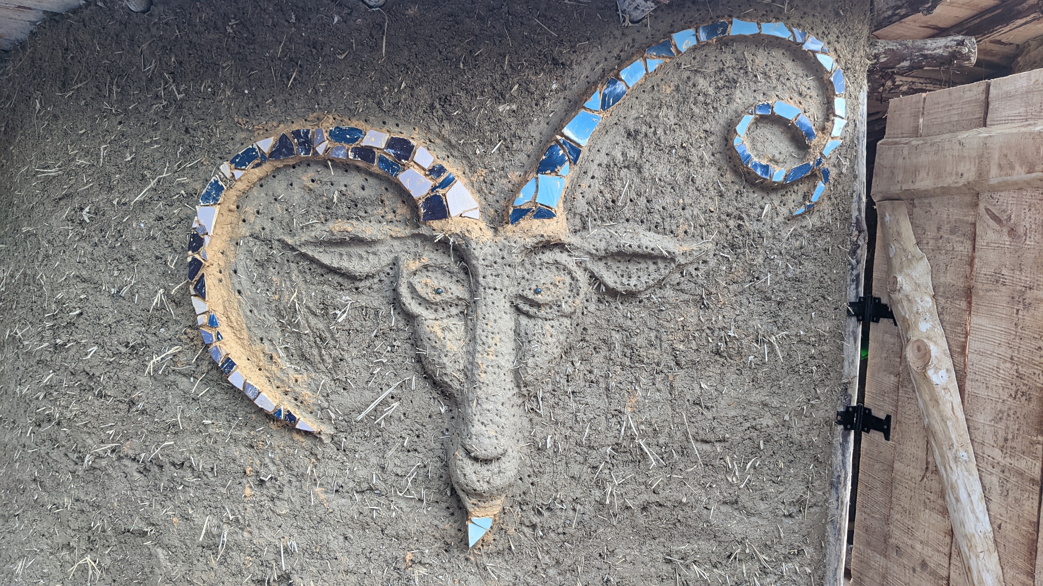 We finished the cobbing and the roof on the goat barn, and Tal has started adding her finishing touches while the wall is still moist. I am waiting for the walls to properly dry before I plaster them. Some cracks are appearing at the posts that are buried in the cob, and I want the walls to properly settle before I fill them in. Only then will I plaster.