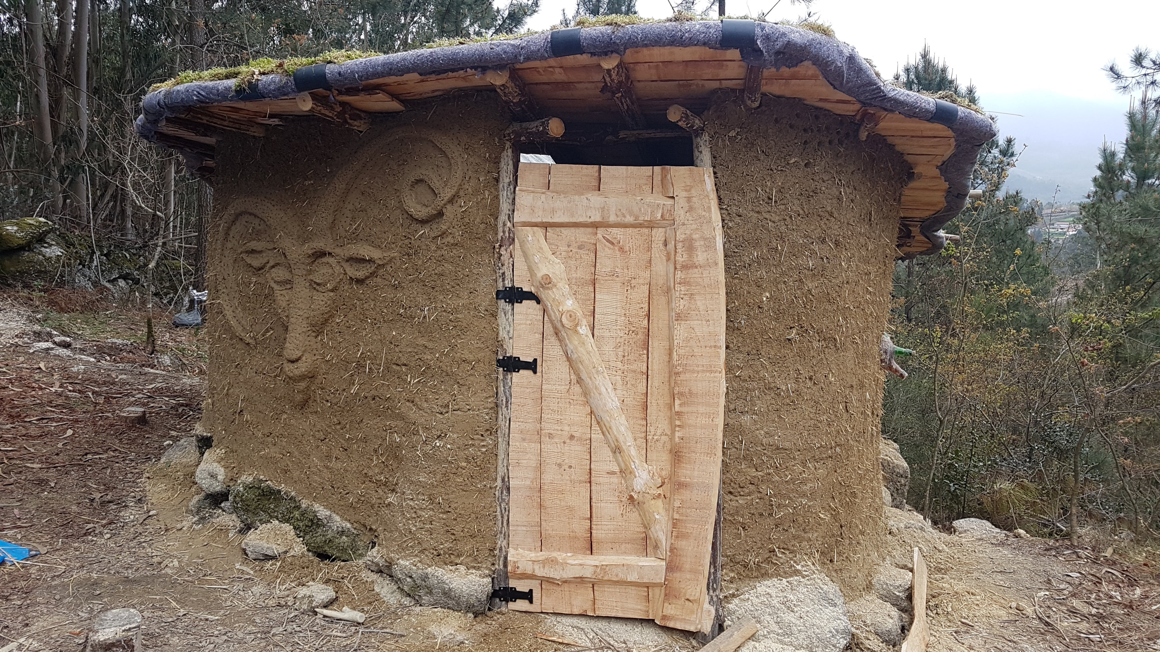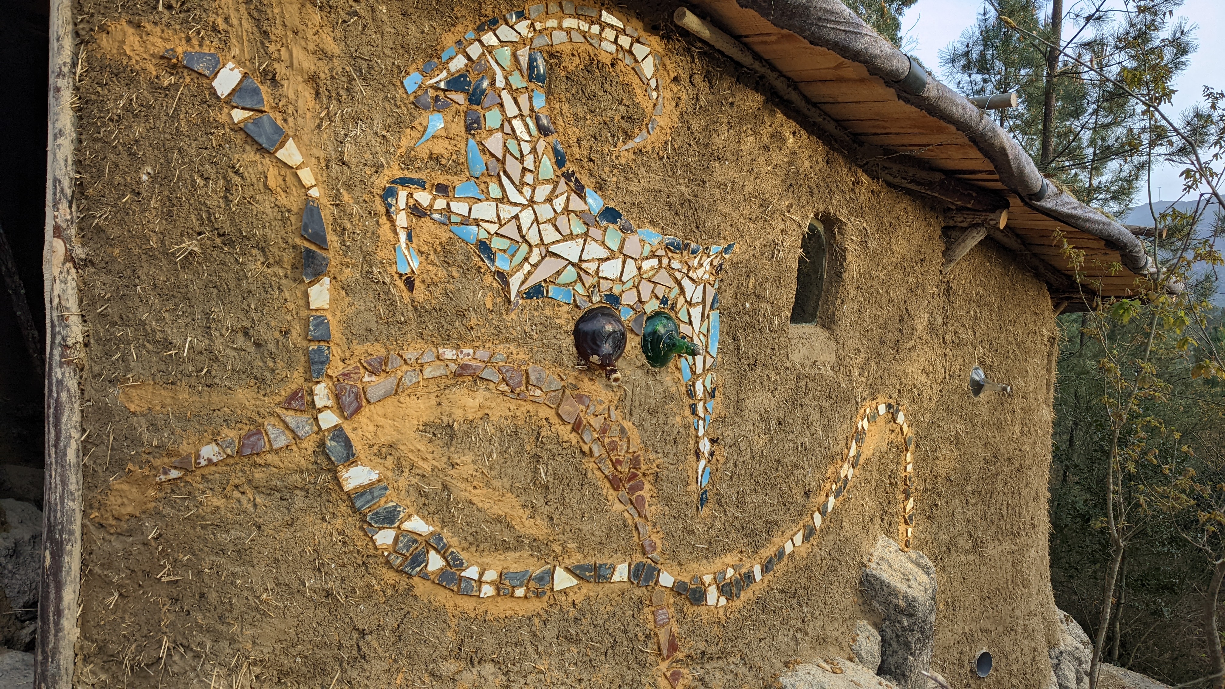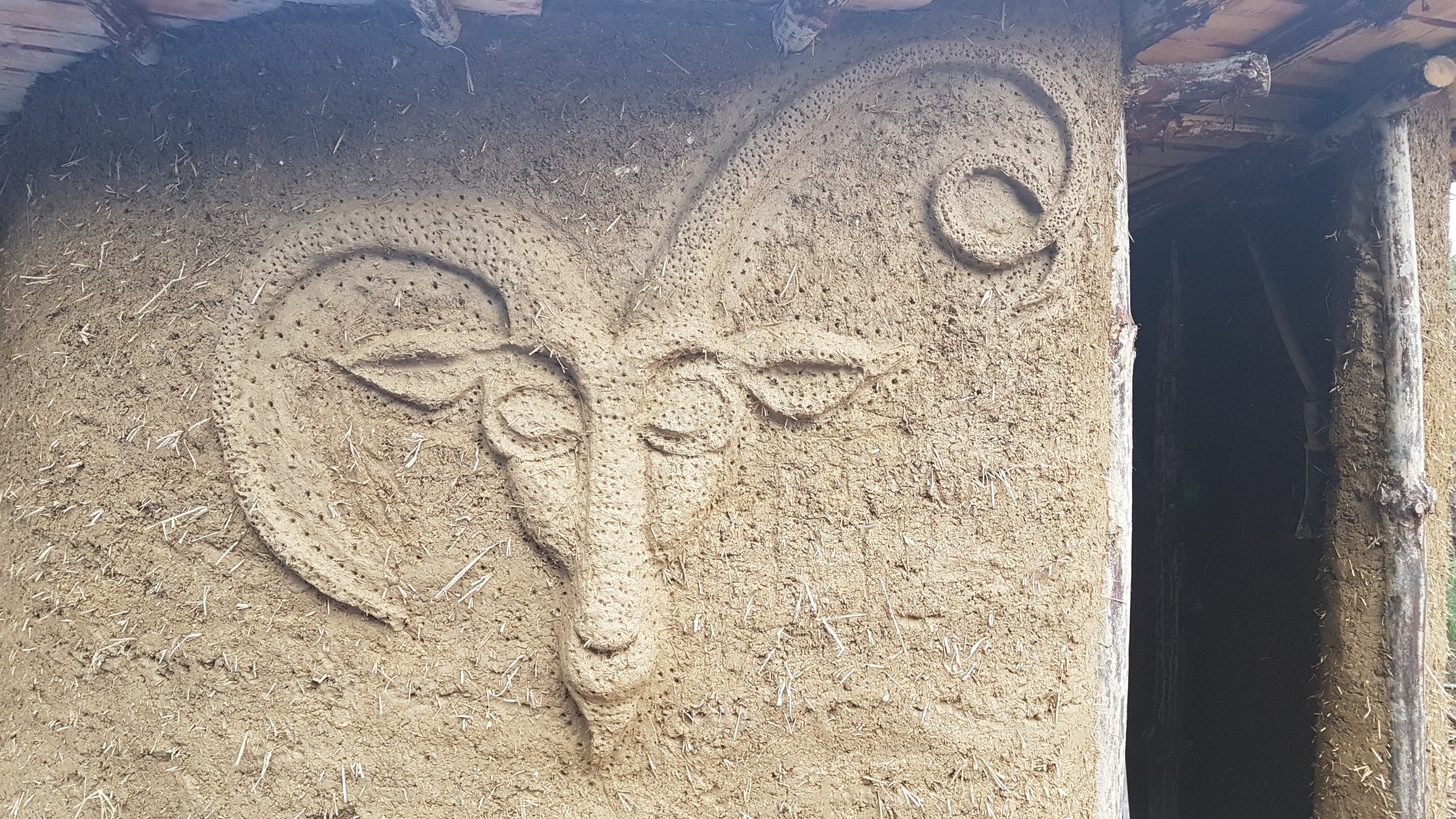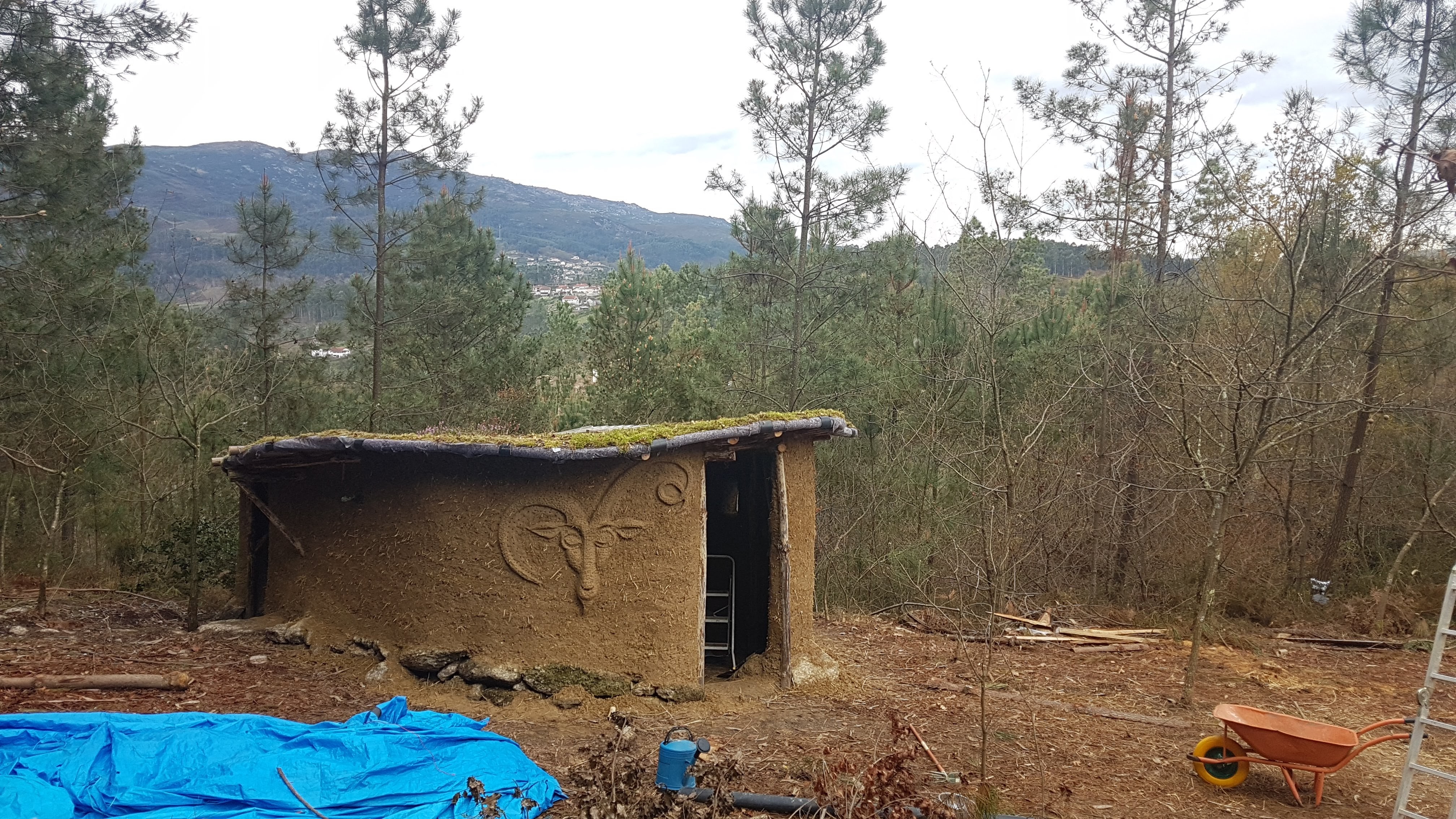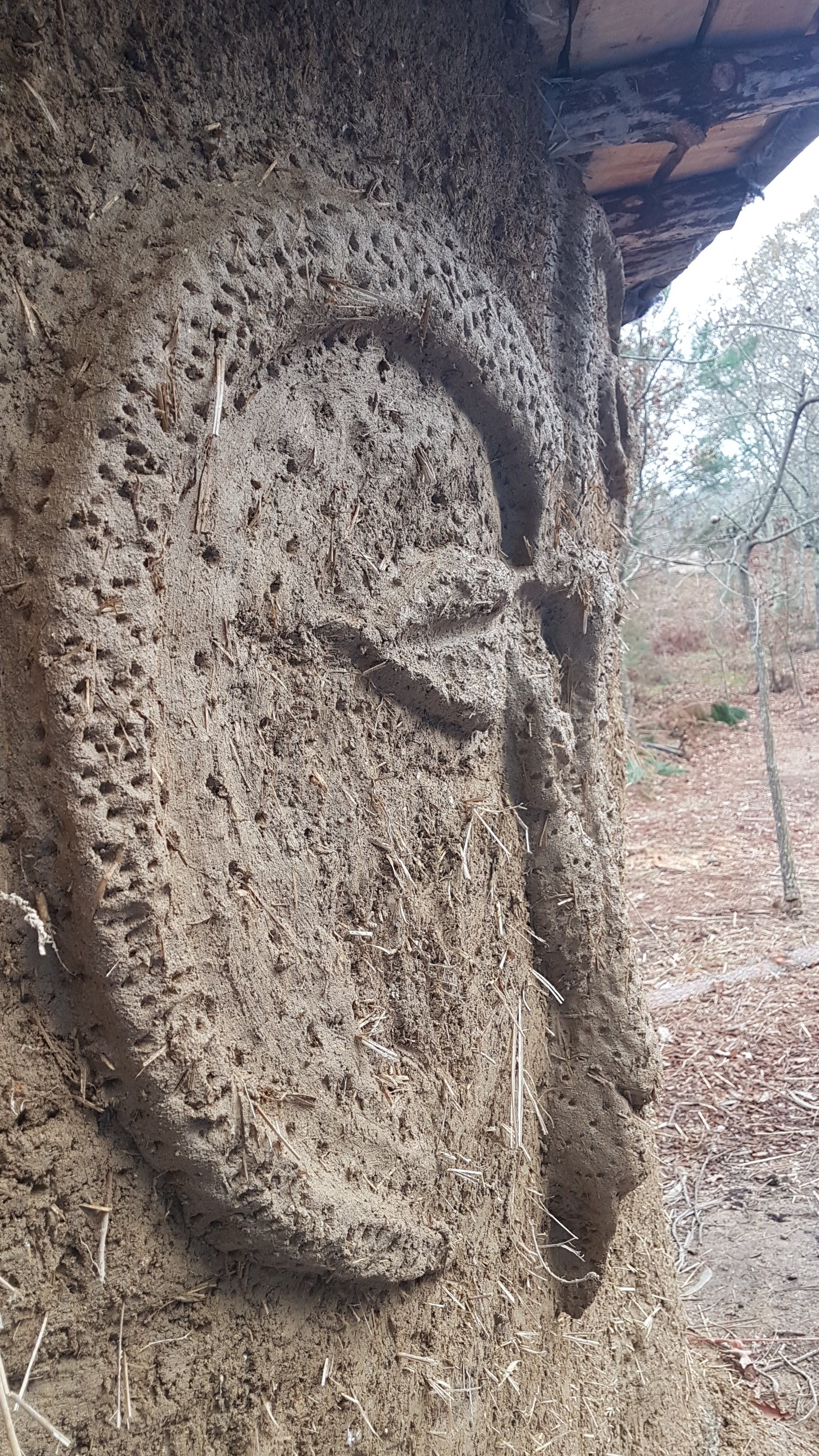 We finished the cobbing and the roof on the goat barn, and Tal has started adding her finishing touches while the wall is still moist. I am waiting for the walls to properly dry before I plaster them. Some cracks are appearing at the posts that are buried in the cob, and I want the walls to properly settle before I fill them in. Only then will I plaster.