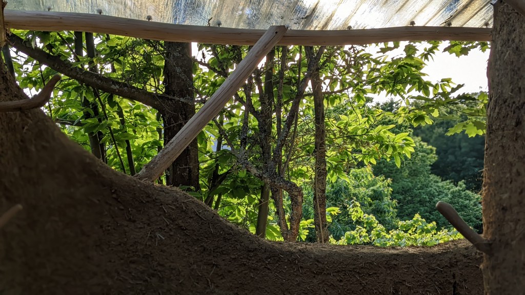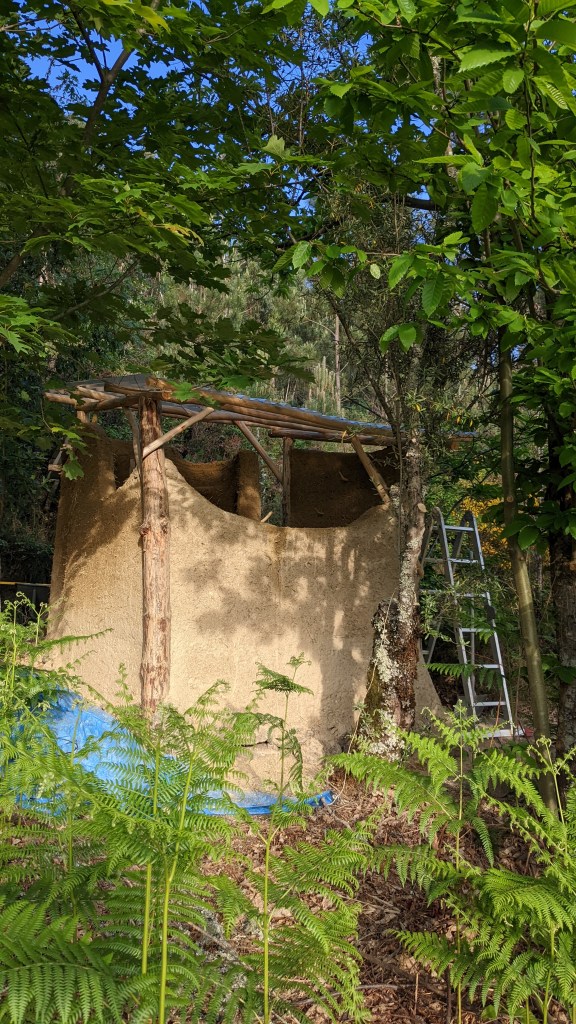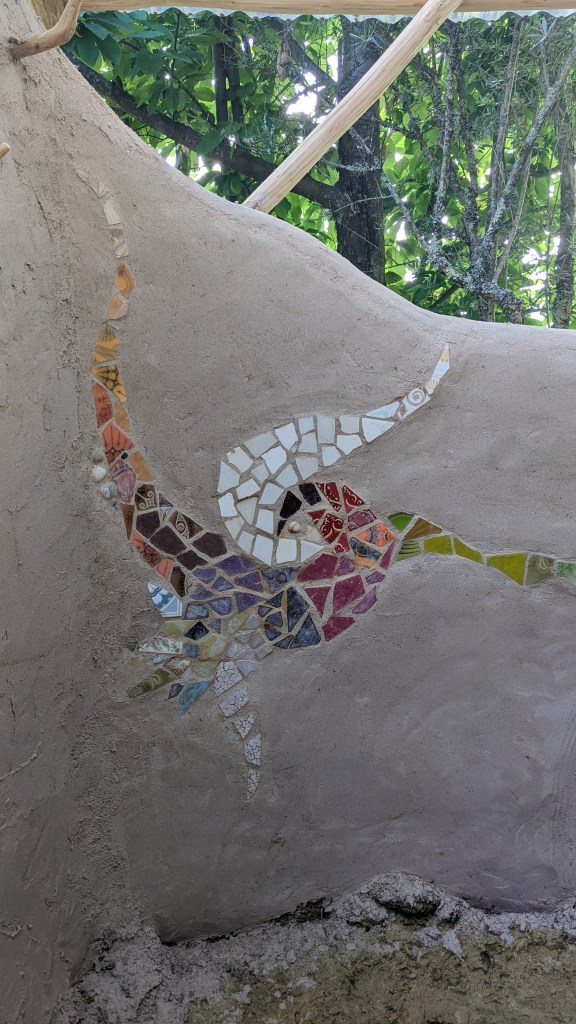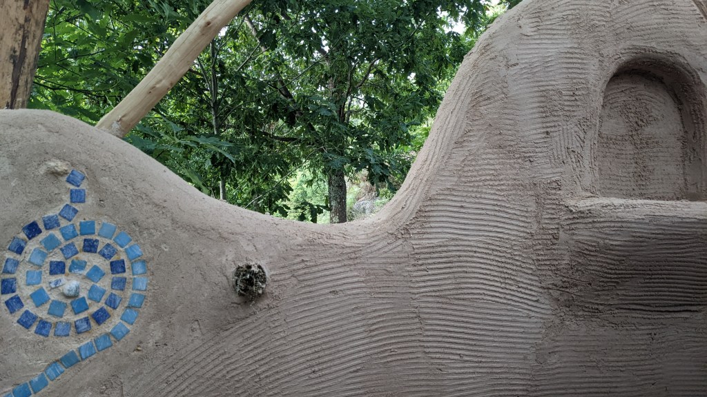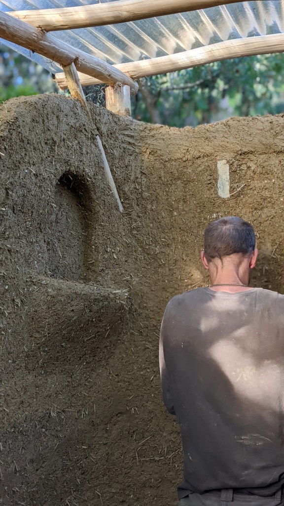 While we were having a series of wonderful family visits, our friends who are living on the land with us finished cobbing the outdoor shower. I then did some trimming, and added the niches in the showering space.
