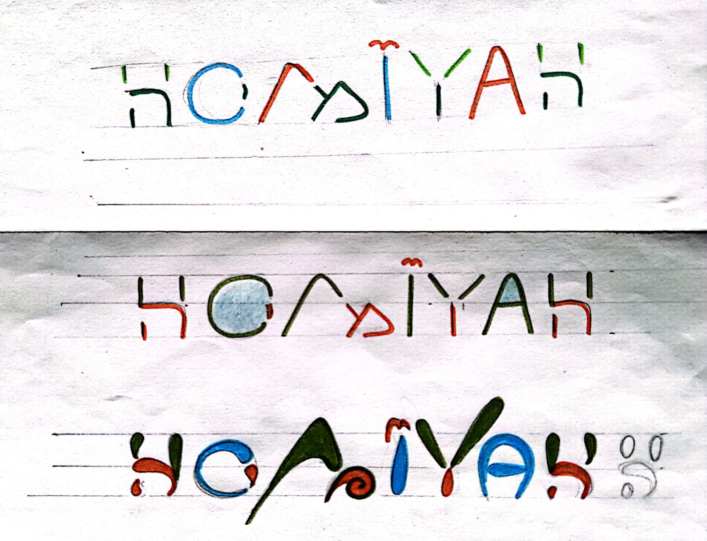 The brown letters read “הומיה” from right to left, and everything together reads “Homiyah,” from left to right. As Tal played with the logo she found the green of our trees, the brown of our surrounding hills, the blue of our water, and the orange of our rising and setting sun.