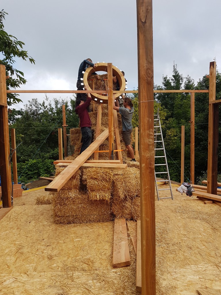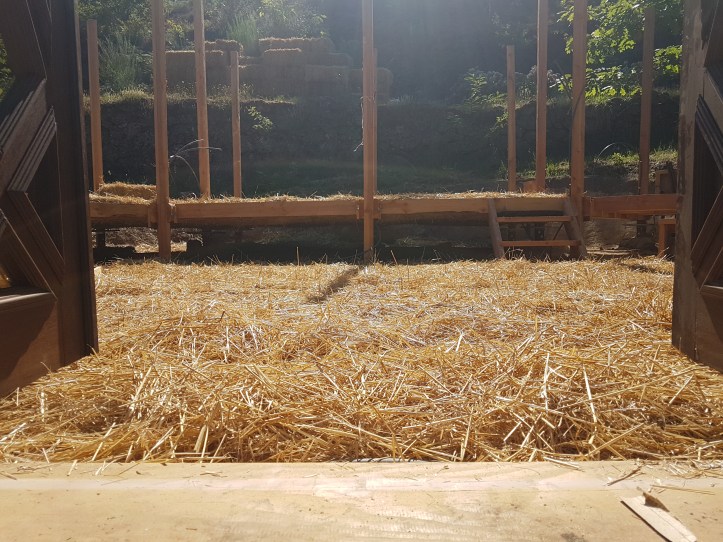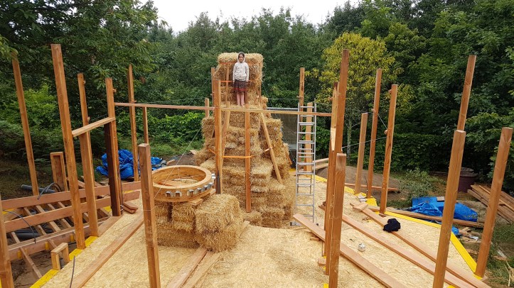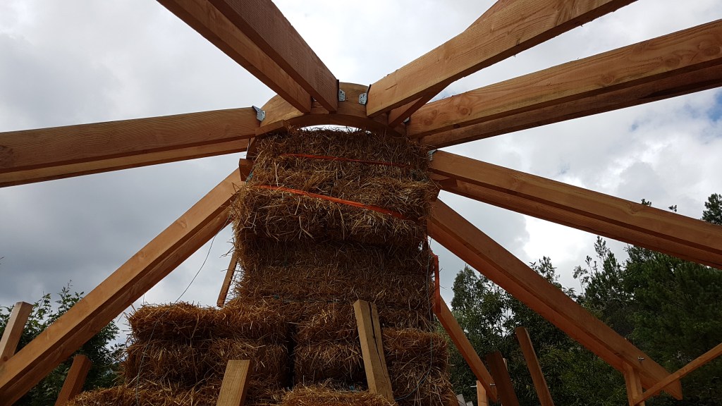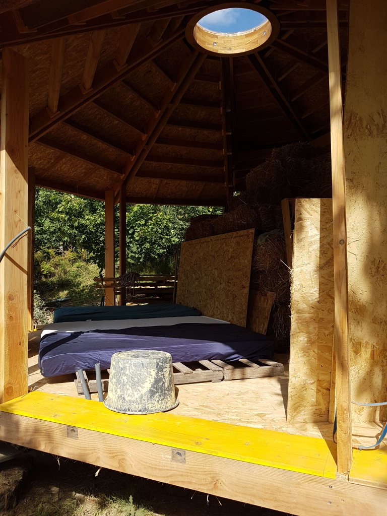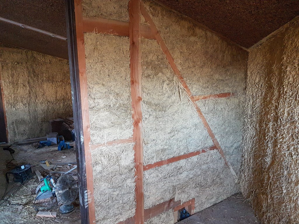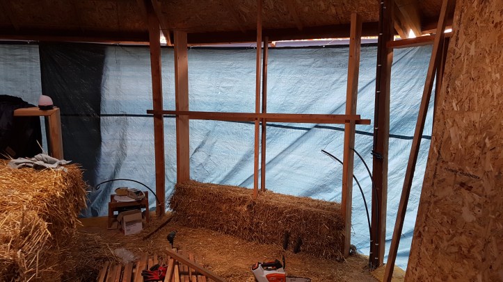 Once we were back from Israel, it was time for the straw bale walls. I applied the Cell Under Tension (CUT) technique developed by Tom Rijven: essentially every bale is inserted in-between wooden posts and is then secured from the top by wood as well. That way, the entire bale is surrounded by wooden slats and becomes a cell. Once all bales are in the wall you can cut the strings and the wall becomes a whole. These types of walls are actually load-bearing, even though I did not use them as such.