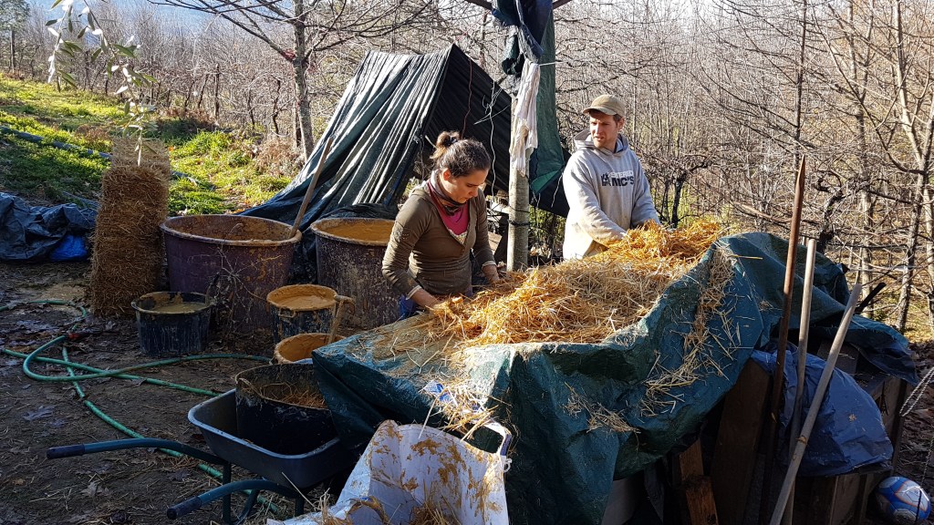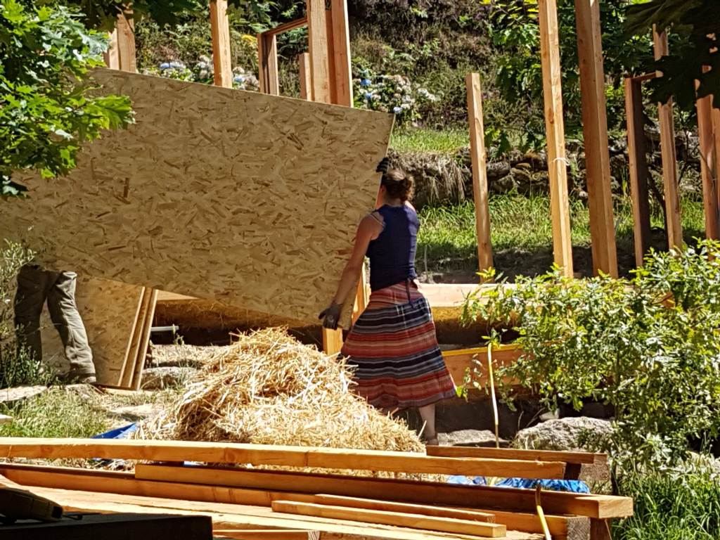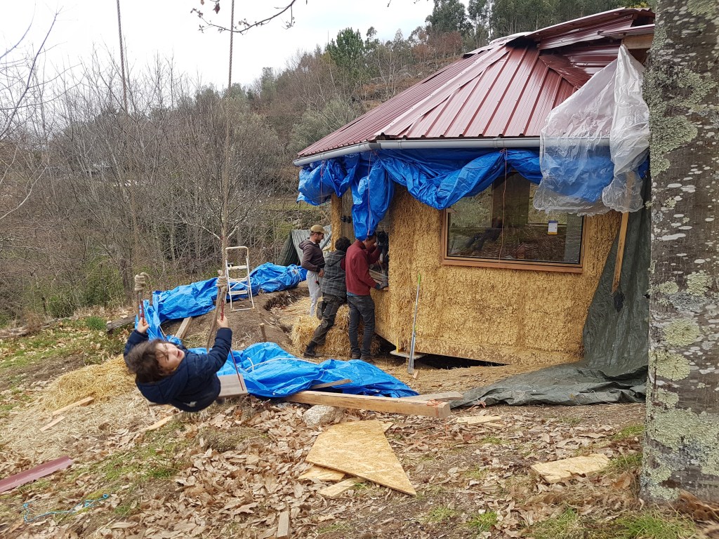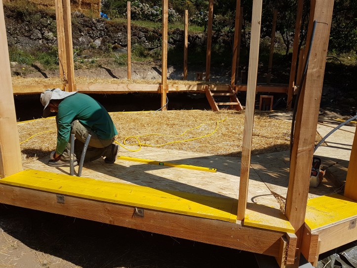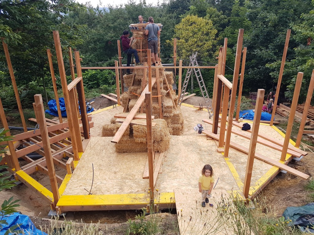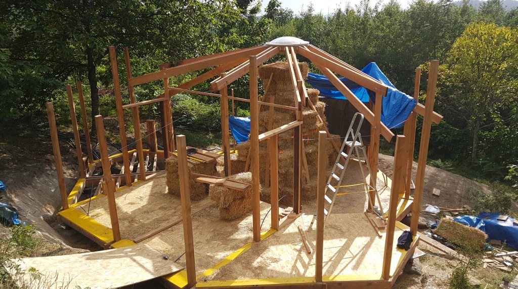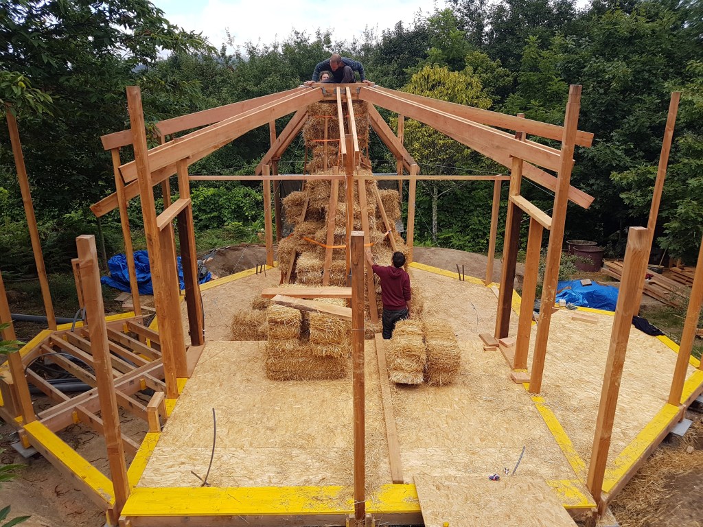 Once we were back from Israel, it was time for the straw bale walls. I applied the Cell Under Tension (CUT) technique developed by Tom Rijven: essentially every bale is inserted in-between wooden posts and is then secured from the top by wood as well. That way, the entire bale is surrounded by wooden slats and becomes a cell. Once all bales are in the wall you can cut the strings and the wall becomes a whole. These types of walls are actually load-bearing, even though I did not use them as such.