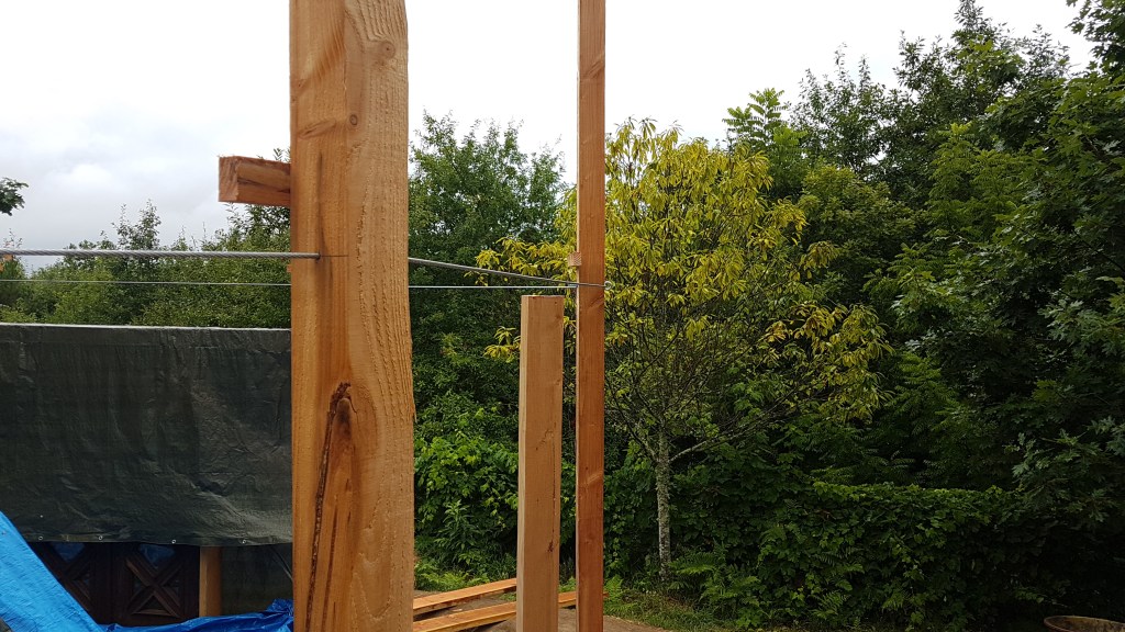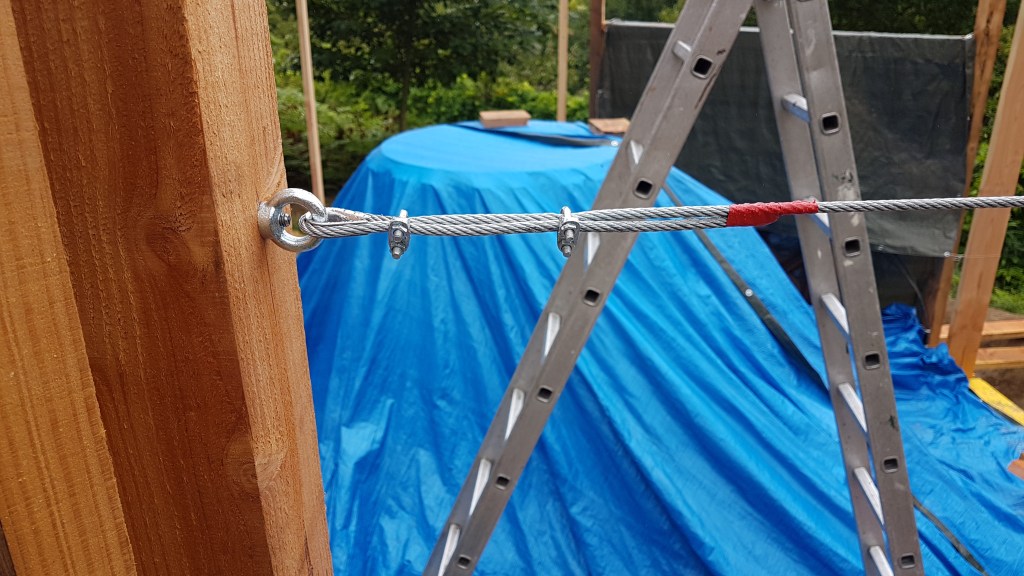 Getting the ring into place was an interesting exercise: I first put the ring at chest level so I could place all the brackets, and only then lifted the ring into the correct position on the straw. I also installed a tension cable along the roof posts.