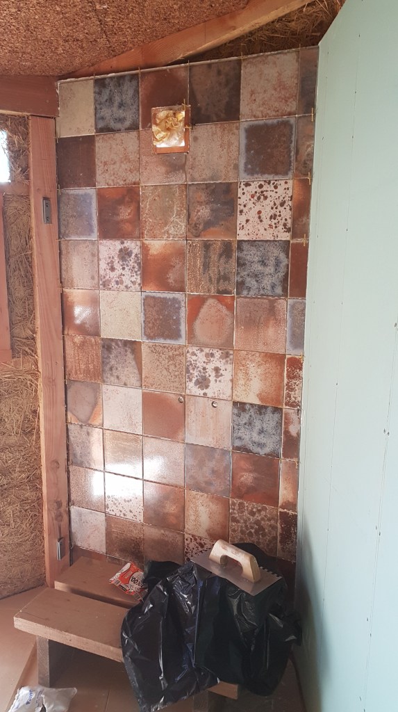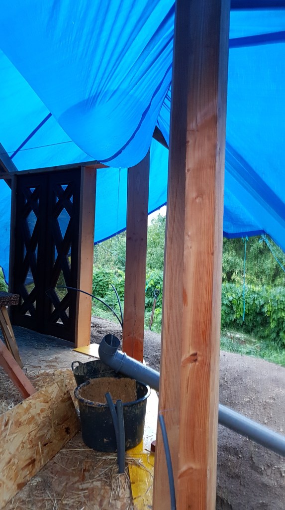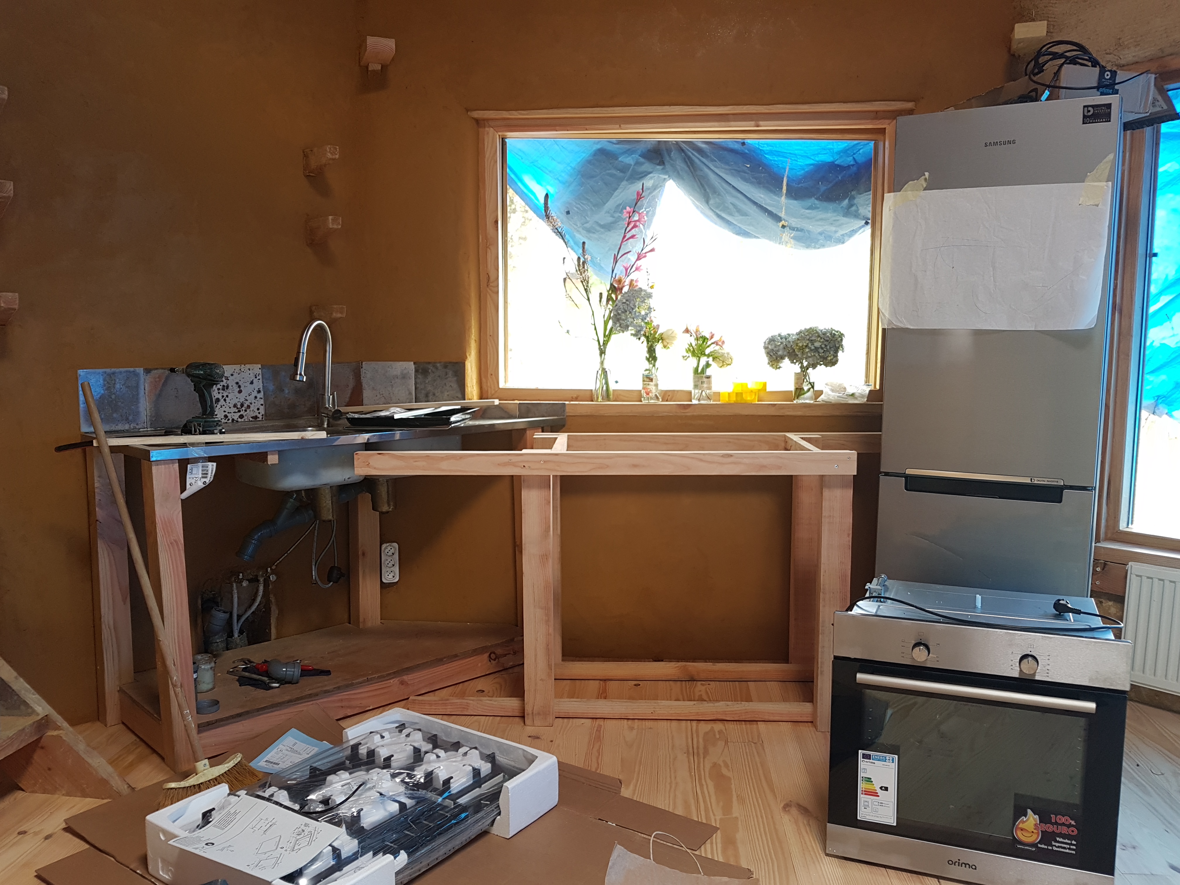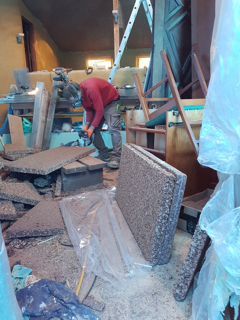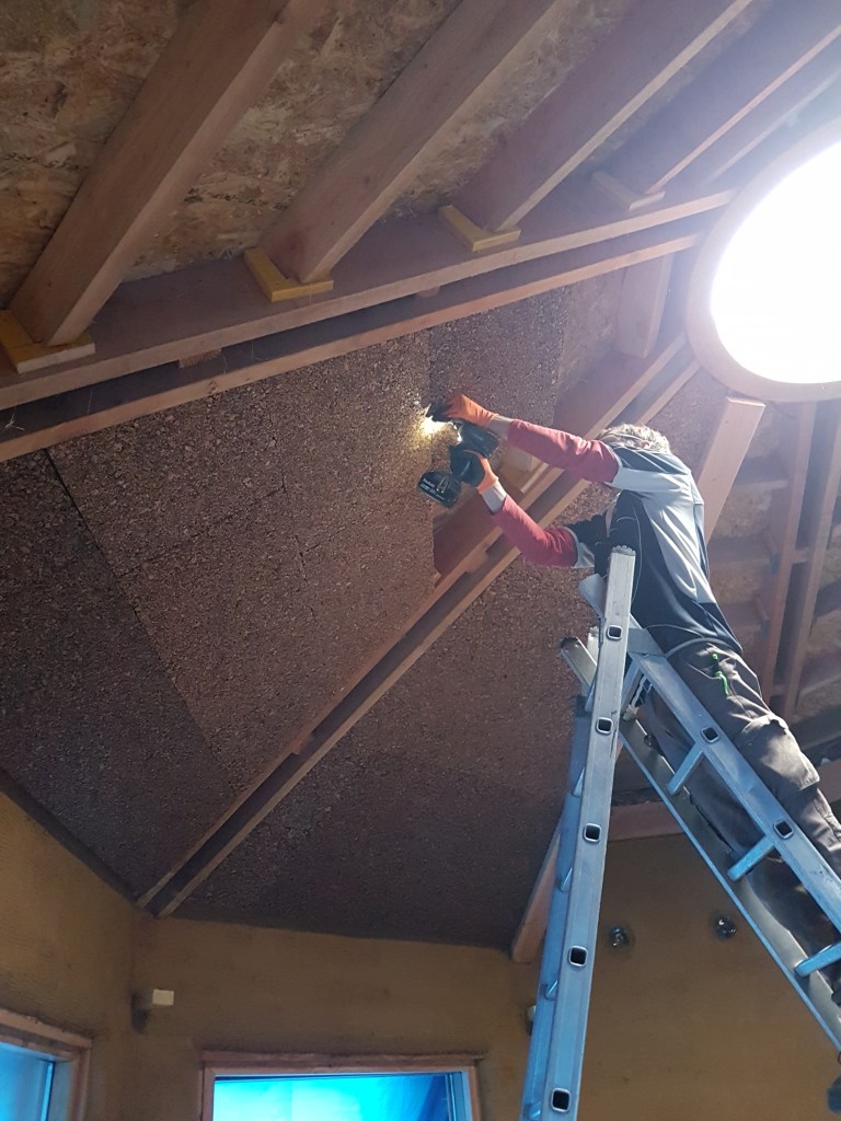 After the inside plastering I connected the gray water system and started with the ceiling. We used cork panels for insulation and ceiling, since we like the aesthetic effect.