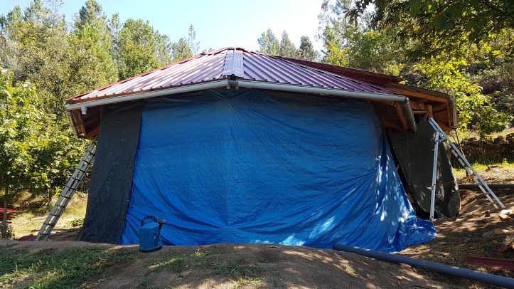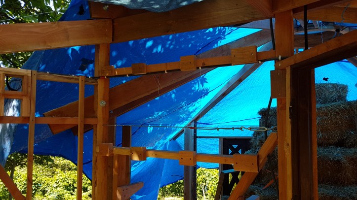 With part of the roof up, I added tarps and started on the wall supports and electricity.
