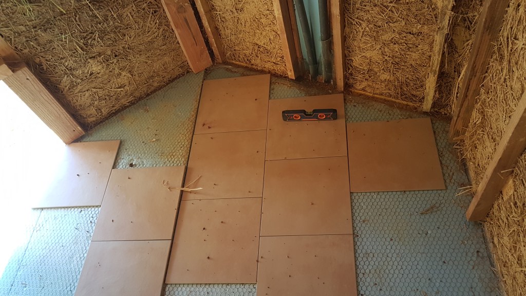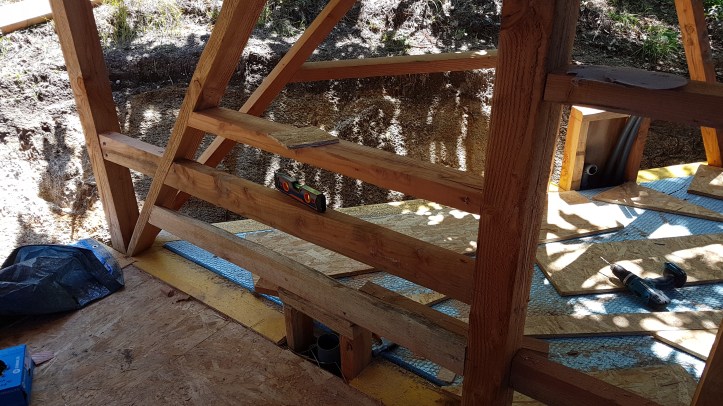 Soon it was time to put in the floor and insulation. We stapled chicken fencing on the bottom of the floor beams and inlaid the first 3 cm with light clay/straw, for fire resistance. Then we added loose straw. The top layer is simply air, connected by holes drilled through the floor supports. Everything is covered with metal insect screens.