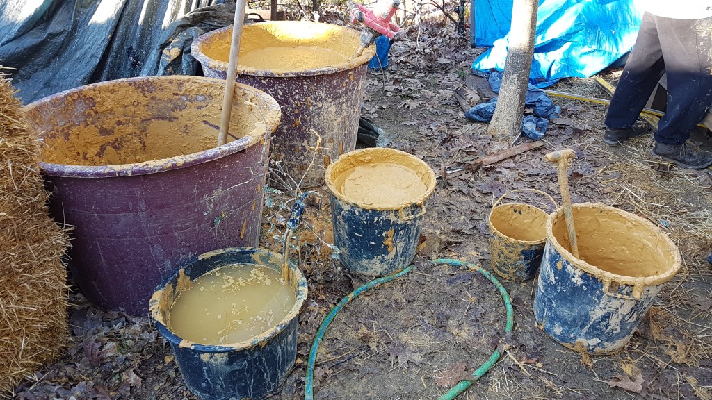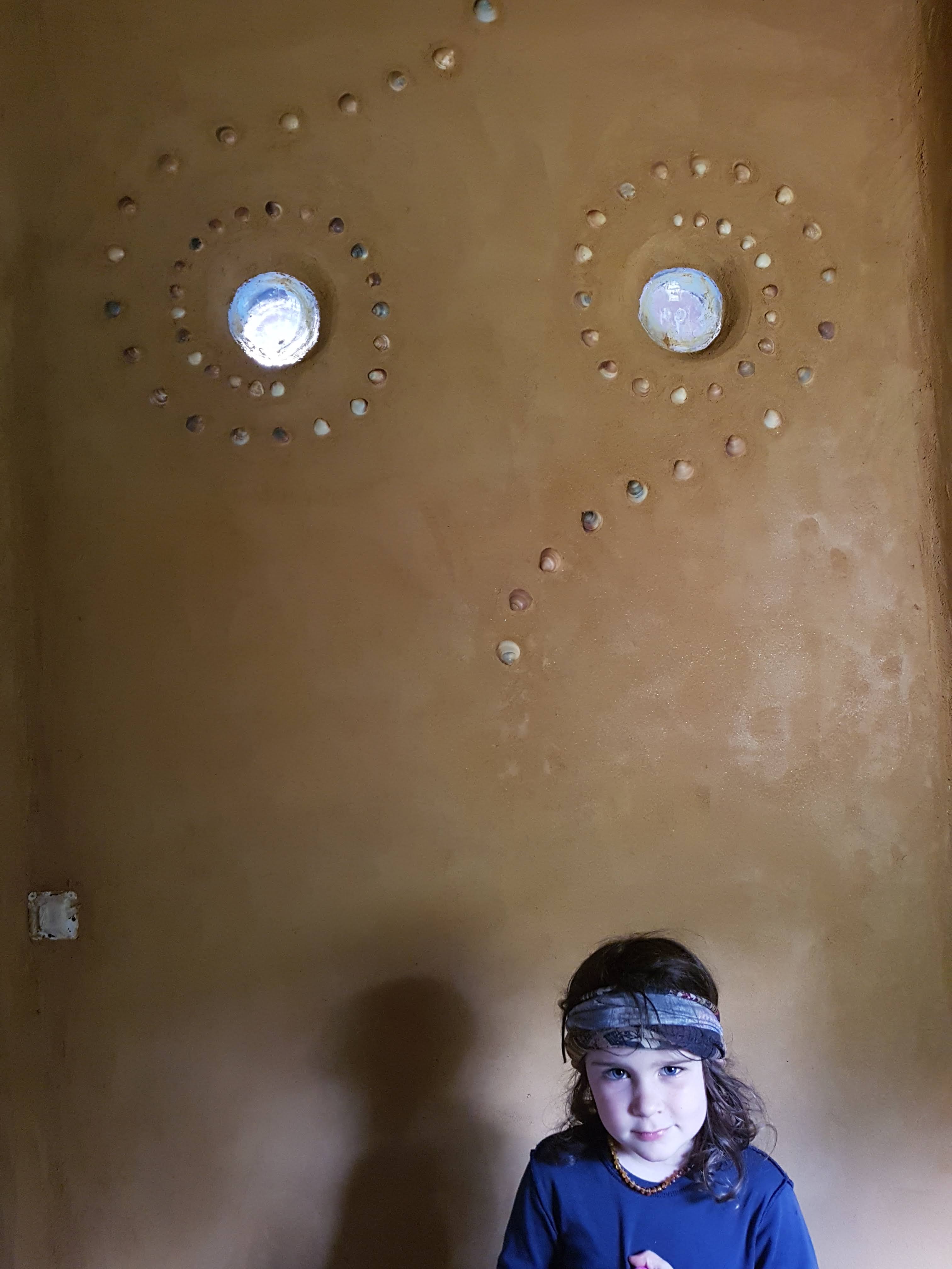 We opted for lime stabilized earth as the first layer for both the inside and outside plaster. For the outdoor plaster I used a finishing layer made of sand, slaked hydrated lime, clay and cow manure (gathered from cows around our land). The finishing layer on the inside is made of fine sand/clay/quark (the latter to add casein).