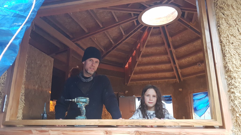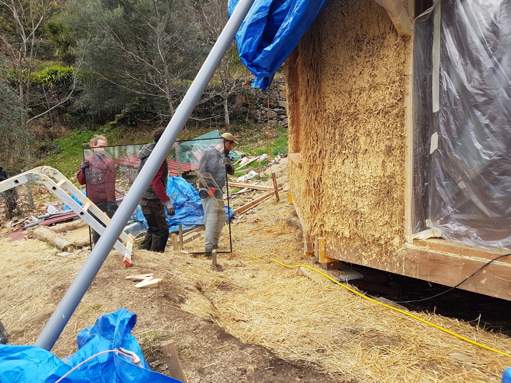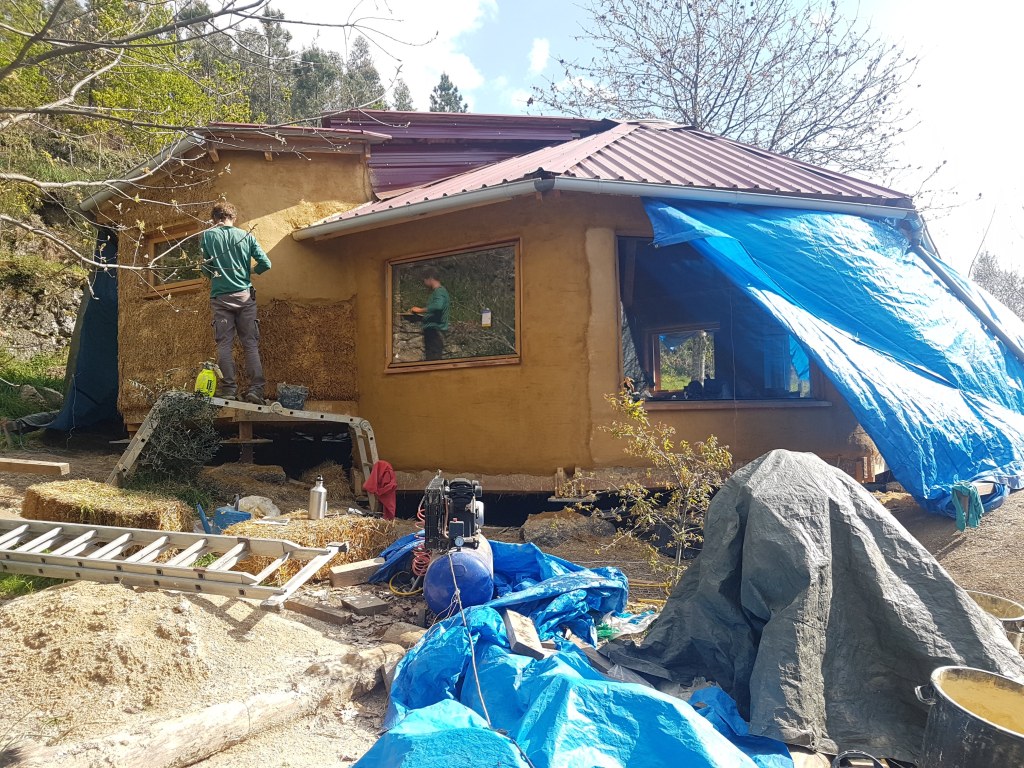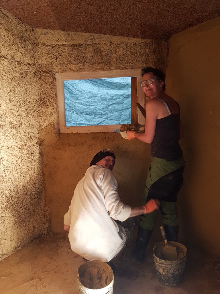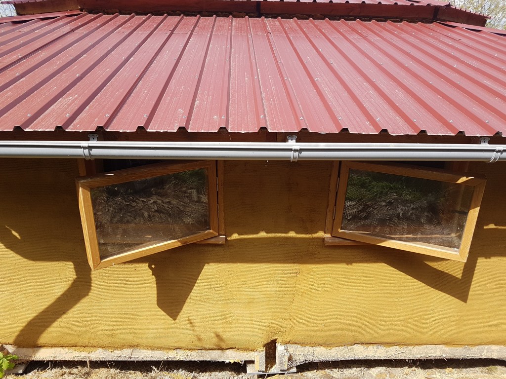We installed the window frames and windows and started spraying the straw bales with clay slip in order to prepare them for the plastering.