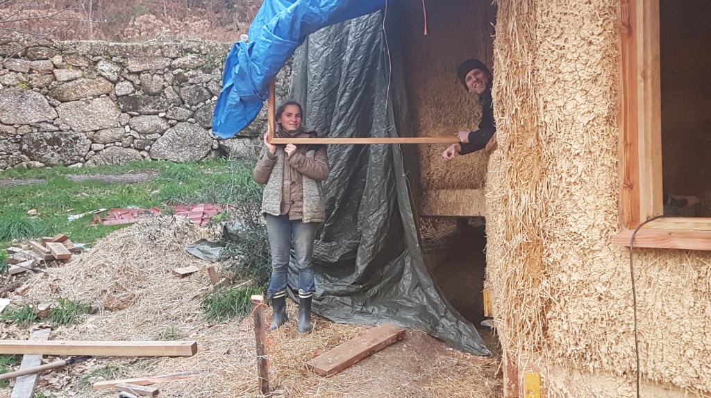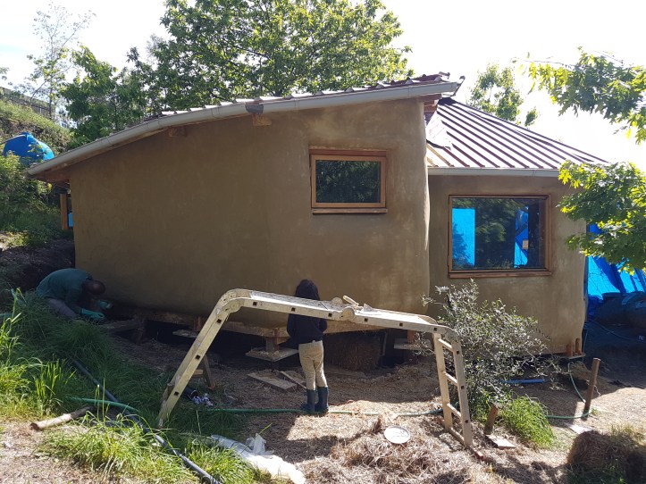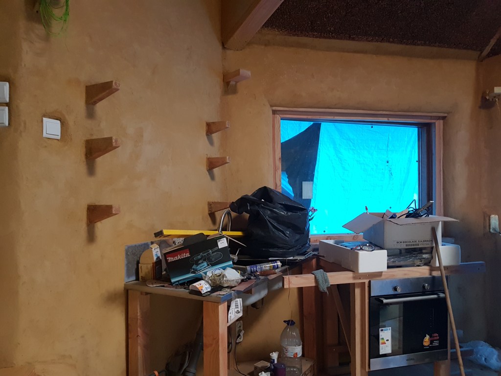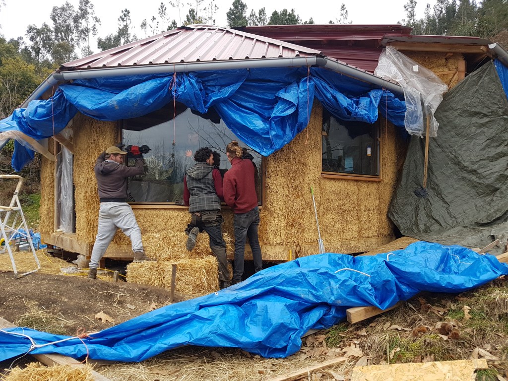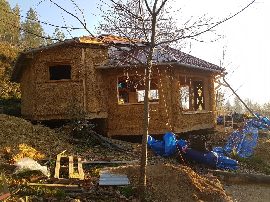 We installed the window frames and windows and started spraying the straw bales with clay slip in order to prepare them for the plastering.