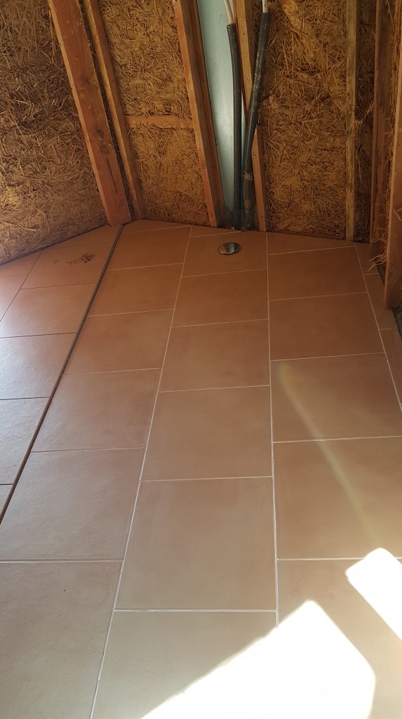 The shower floor is the only place with conventional materials, in order to avoid water problems in the insulation. I used XPS board for insulation and support.