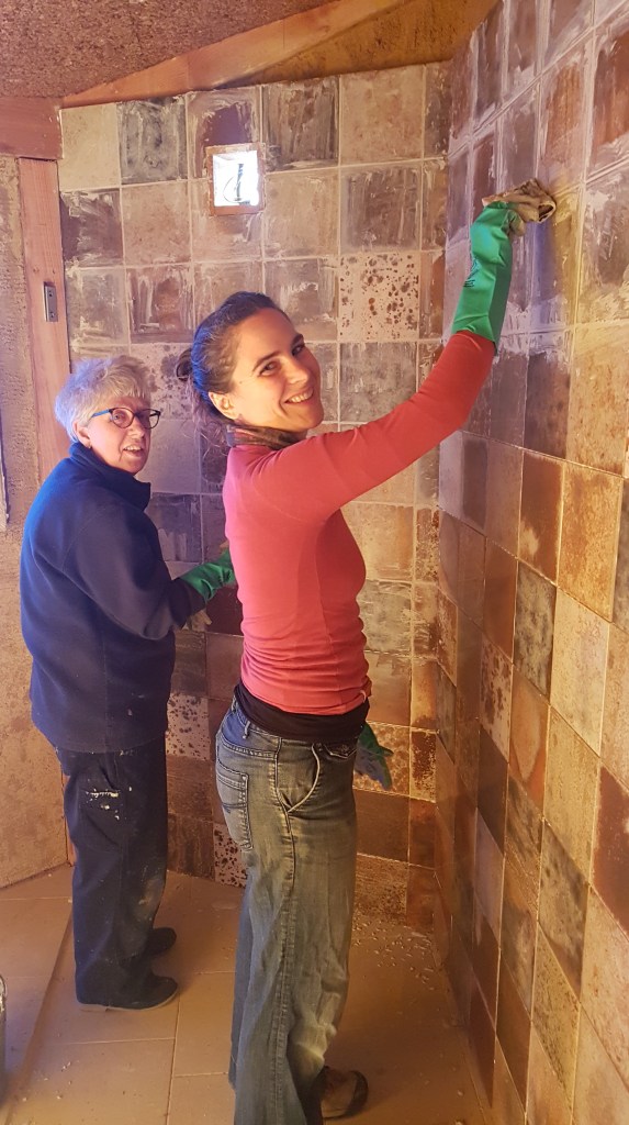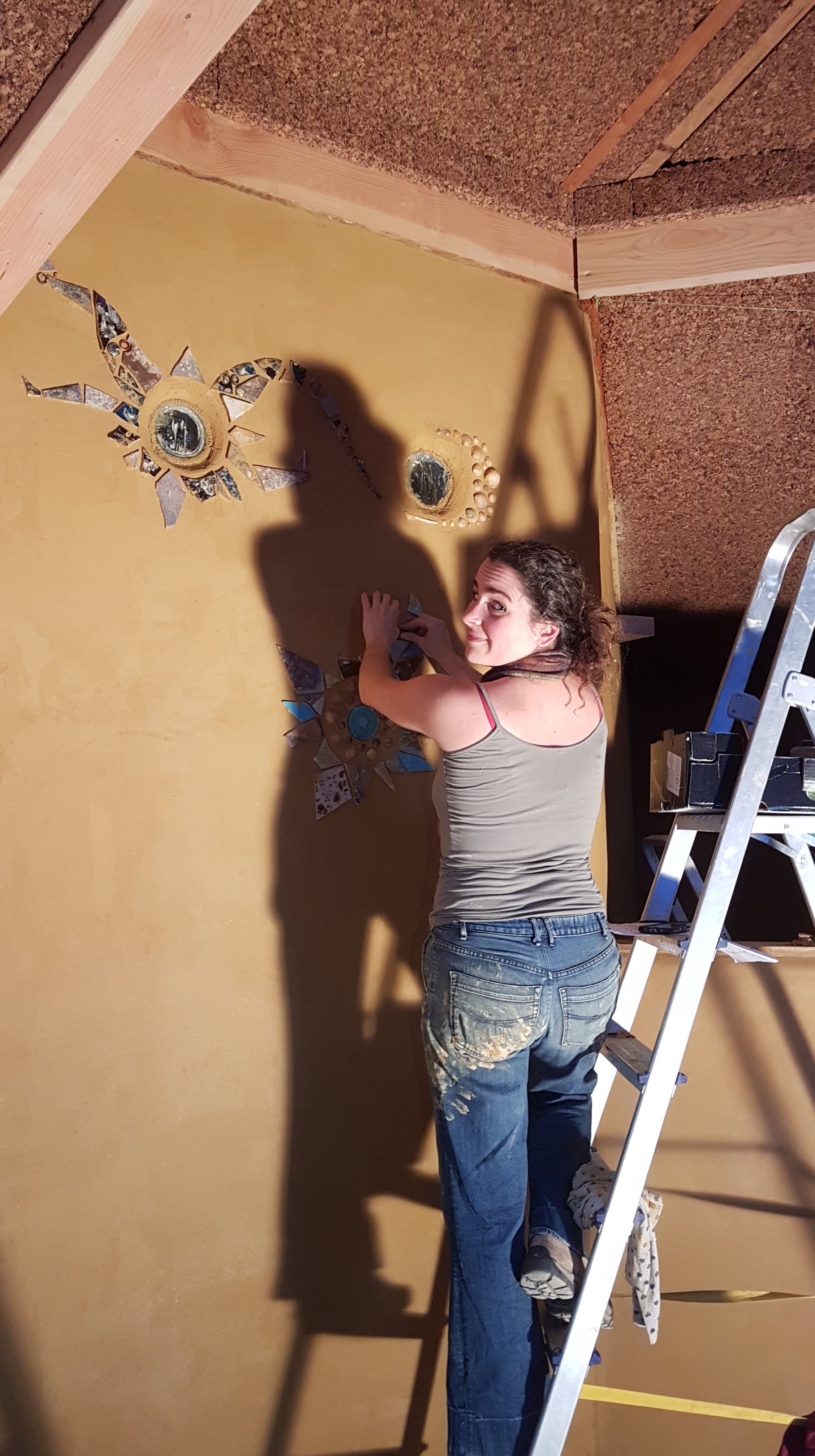 Now it was time for the finishing plaster. I used a clay/sand/casein mix inside, and a lime/sand/cow manure mix outside.
