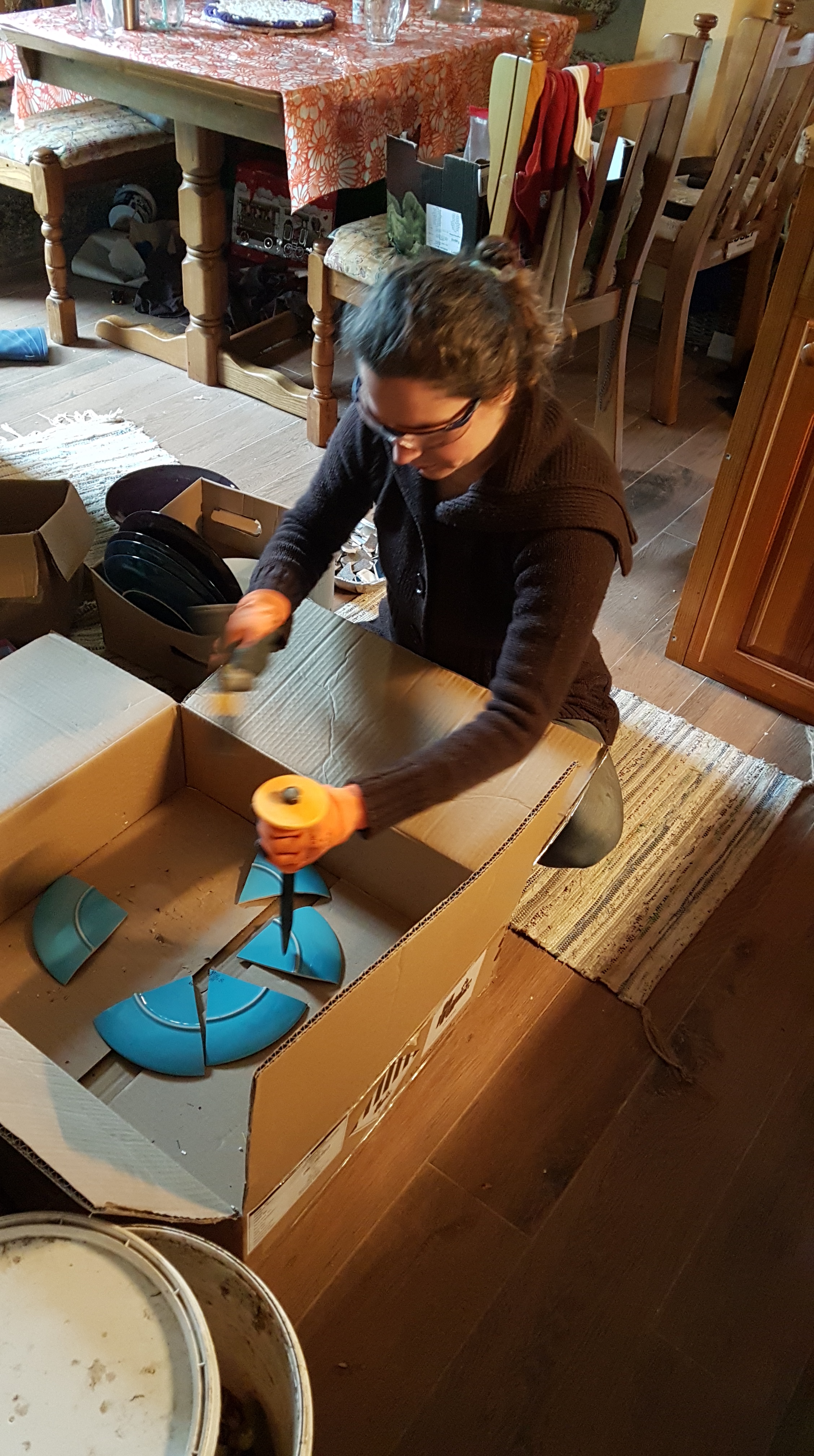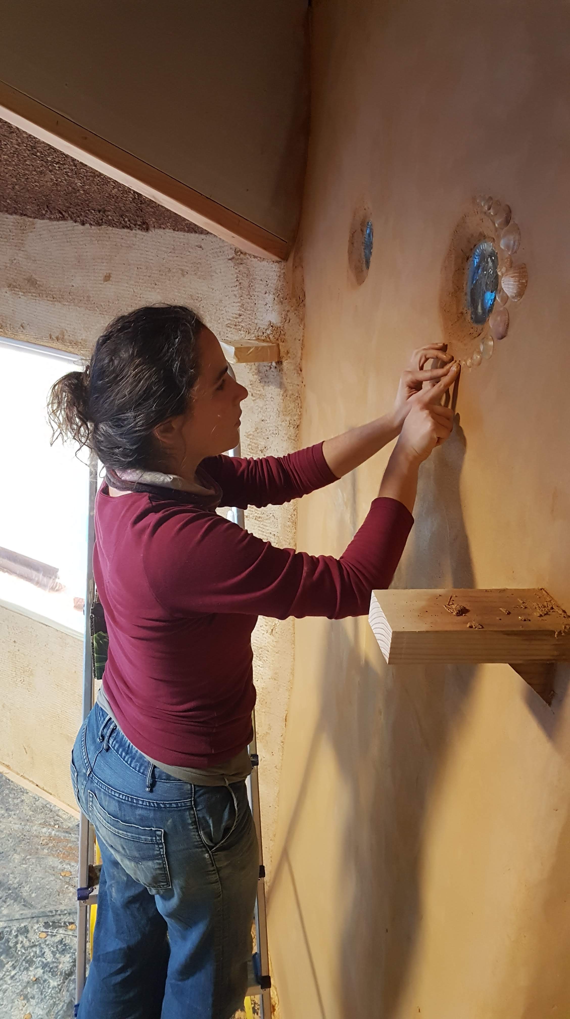 A couple of days before it was time to apply the final plaster, Tal started playing around with a mosaic design for the main wall of the living room. It’s made out of broken dishes and tiles, seashells from Tel-Aviv collected a day before Tal’s surgery, and sentimental pieces of jewelry from friends and family. She put it onto fresh plaster by dipping the tiles in clay slip. It was her first time making a mosaic, so it was a little stressful and lasted well into the night, but it was a good experience and we love the end result. In the meantime I started on the kitchen.