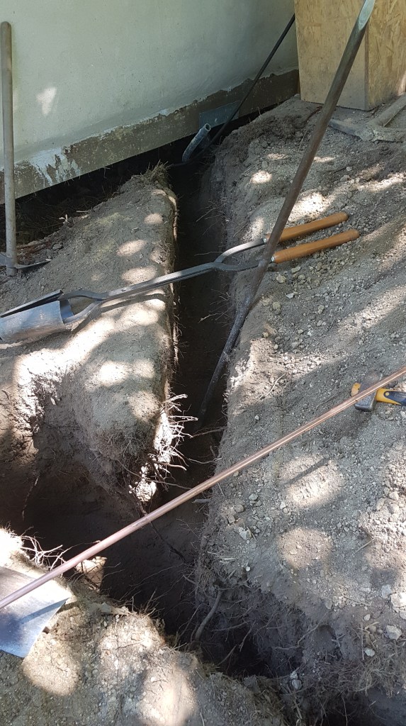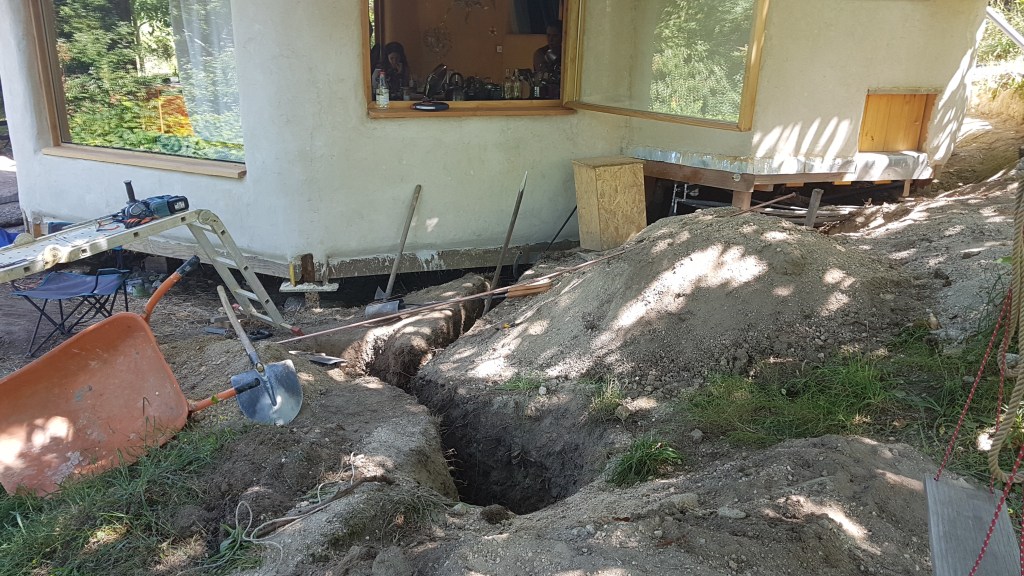 However, since we liked the idea of using the earth to cool the air, we decided to install a 30 meter long earth tube instead. The optimal depth for an earth tube is 300cm, but since I was digging by hand and the subsoil here is quite hard, I was not able to go much deeper than 110 cm at the deepest spot. This means we are not getting top performance – but it does keep the house cooler for most of the day in summer.