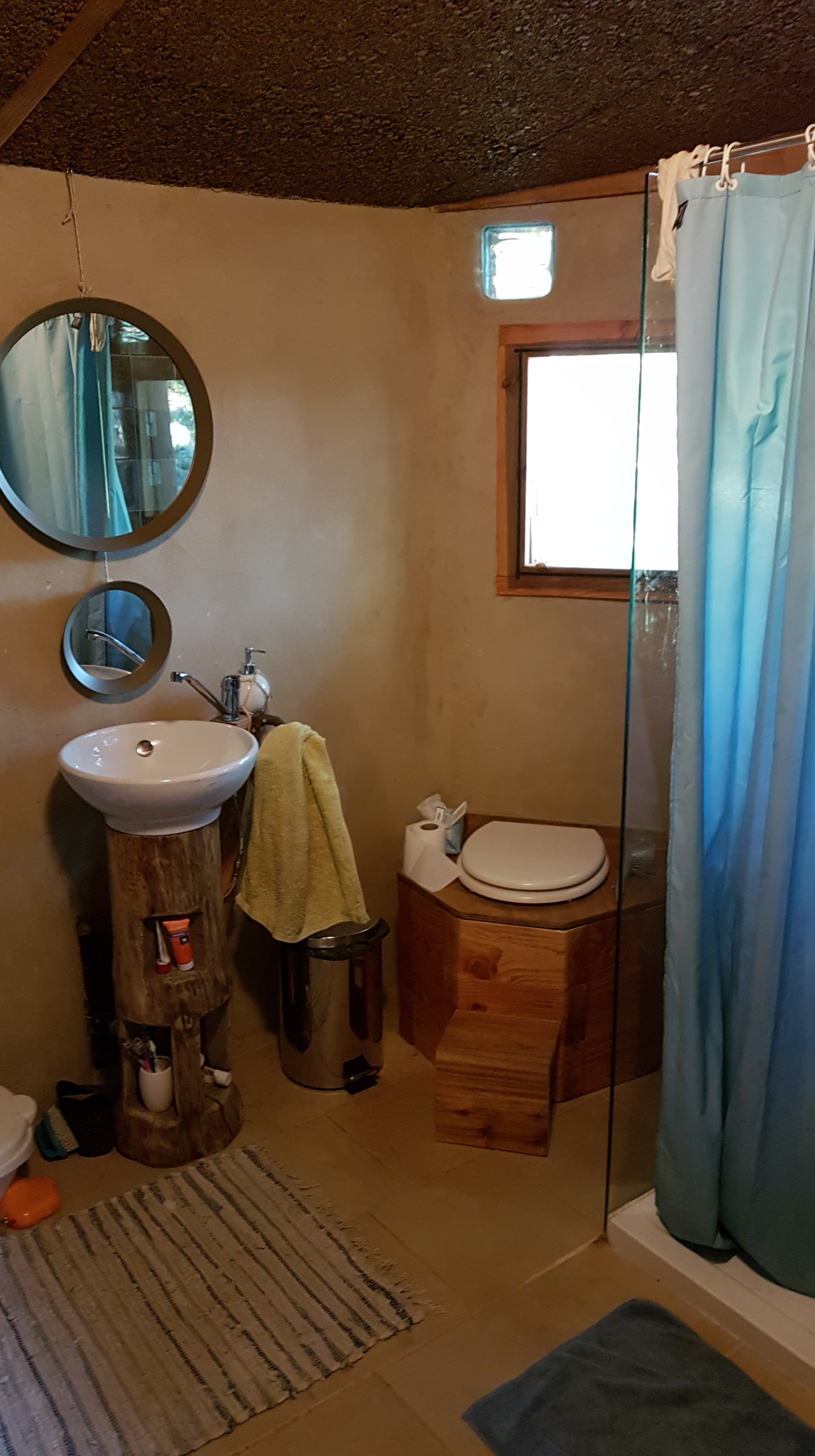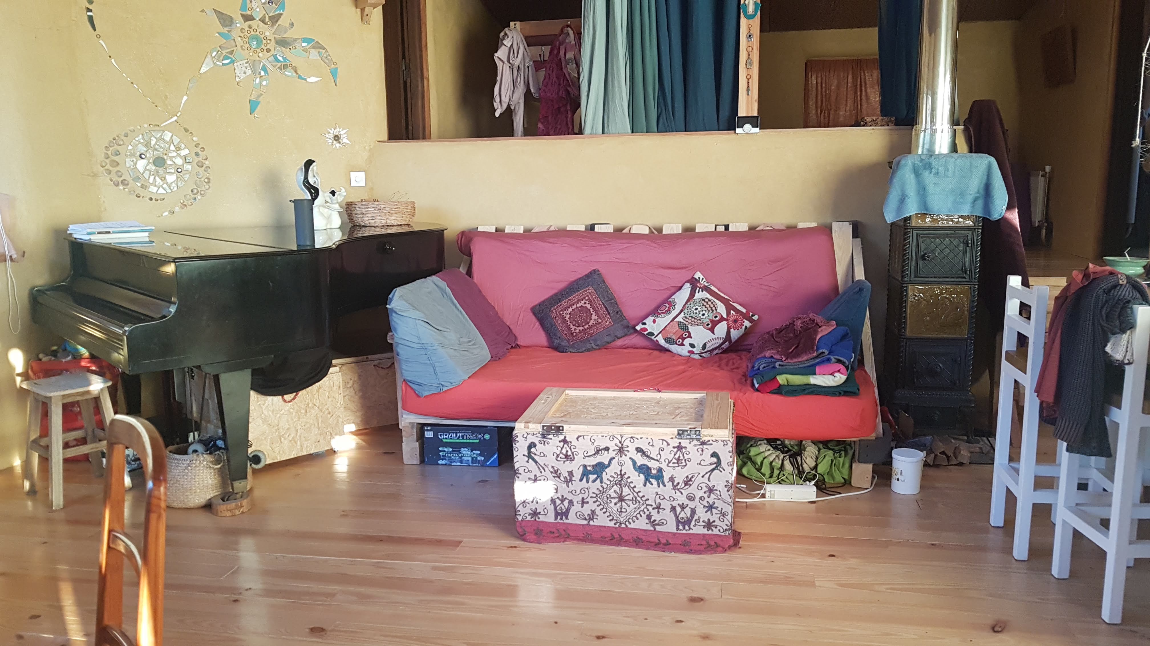 For the first few months of the building we were living in our neighbors’ downstairs apartment. Once the weather got better we moved into our own bell tent. We pitched it next to our barn, where we set up an outdoor kitchen, a watering-hose shower, and a compost toilet. The kitchen had no running water, so Tal had to carry water up daily. We got drinking water from our friends’ spring, a 15-minutes drive away.