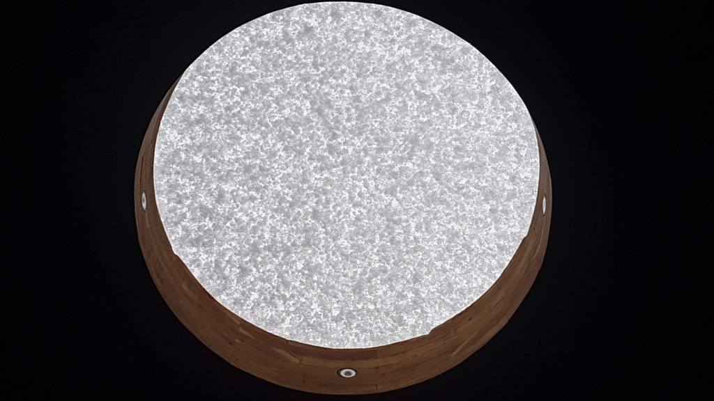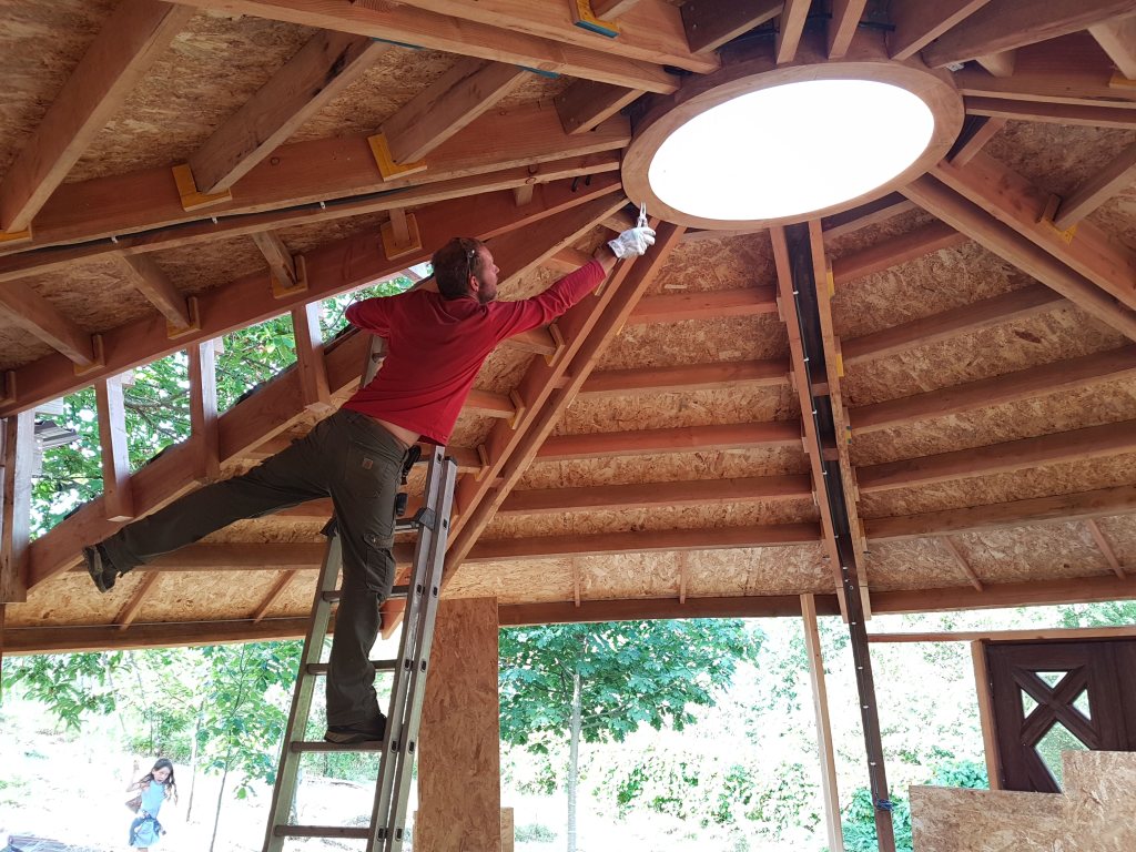 Next up was the roof. We decided to use a wooden center (compression) ring with a skylight. We custom-ordered the chestnut ring from a local carpenter, who also made our window frames.