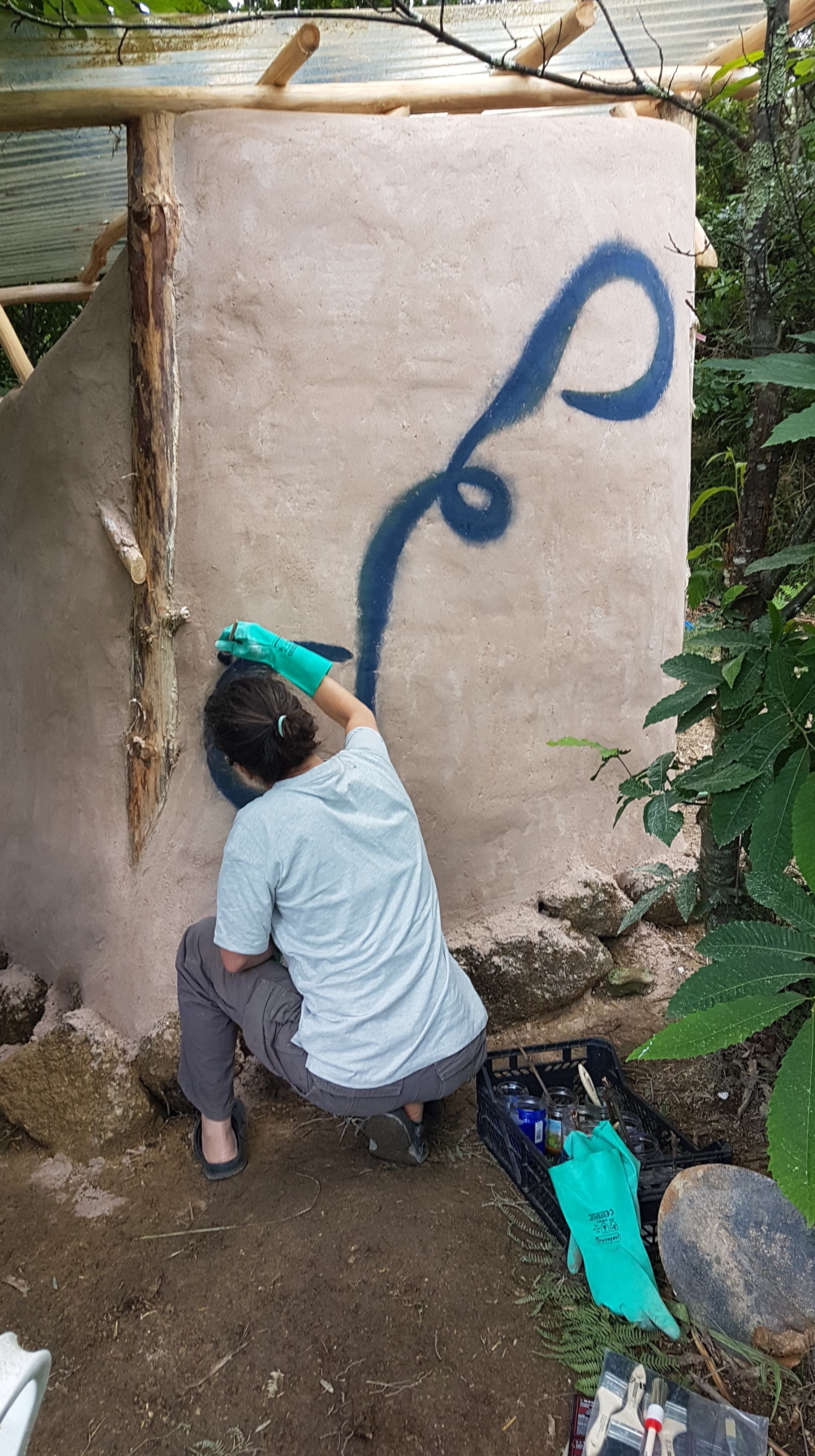 Finally, there was only the outside of the shower left for Tal’s finishing touches. For this we decided to experiment with Fresco lime paint–100% mineral paint composed of slaked lime and natural pigments, applied directly onto fresh lime plaster. As per her tradition, Tal incorporated the Hebrew word for “water,” “מים,” into her design.