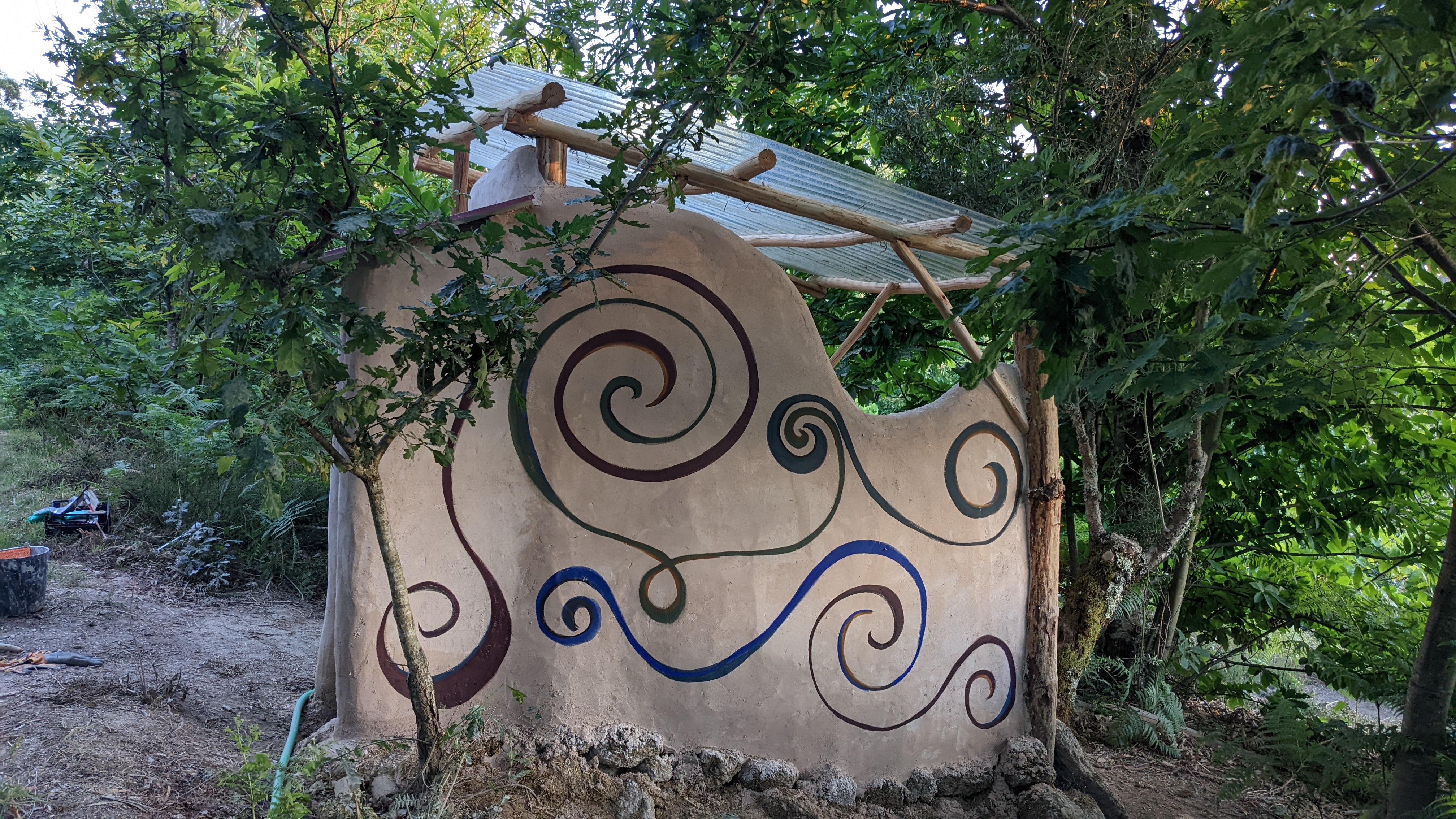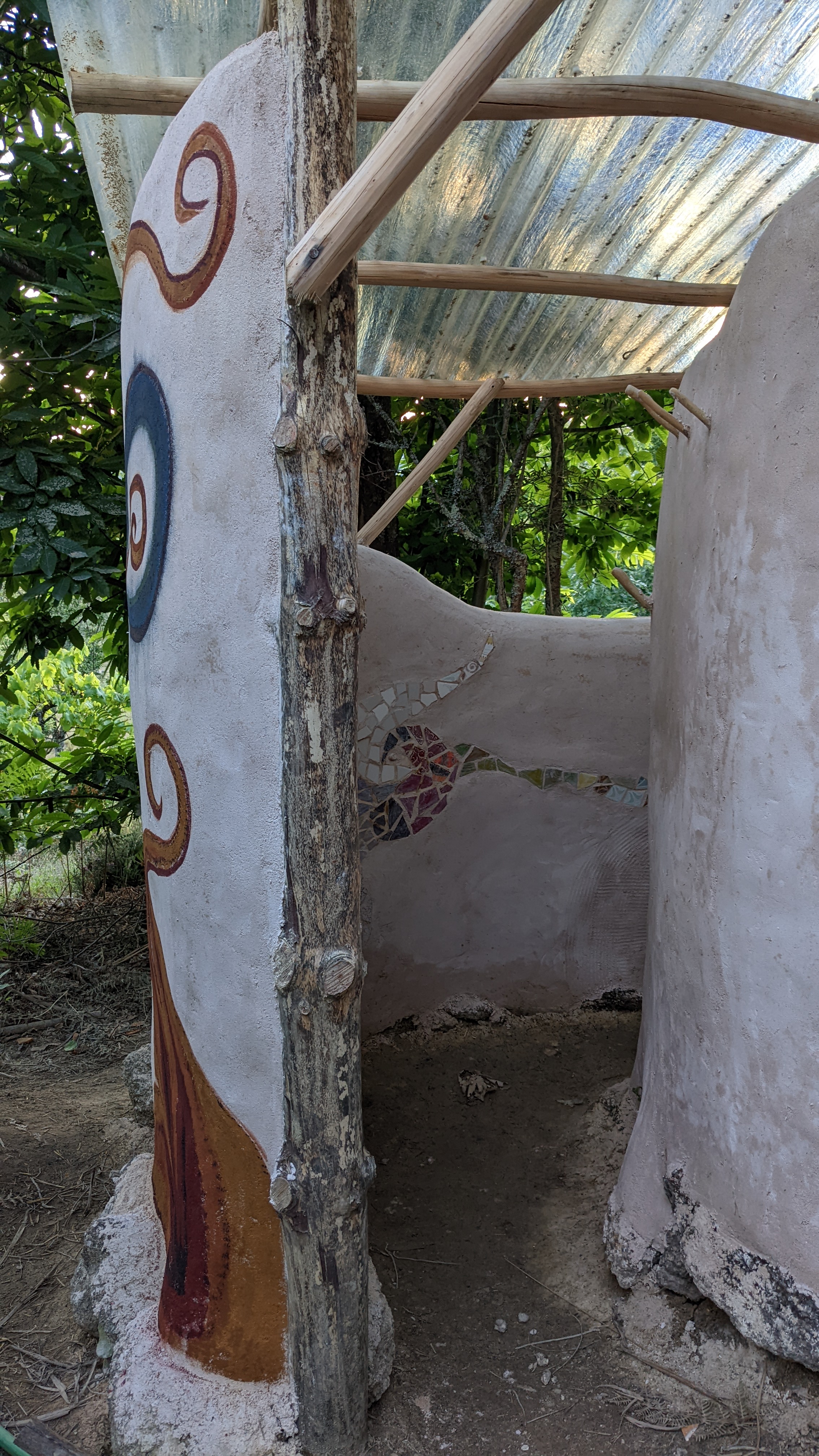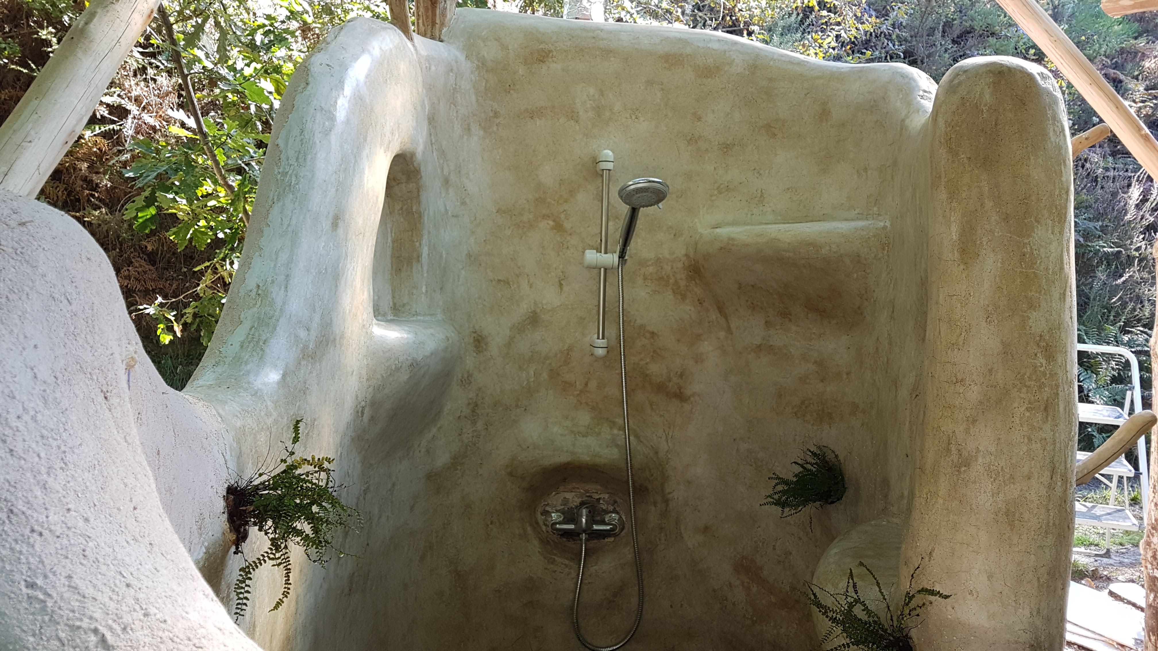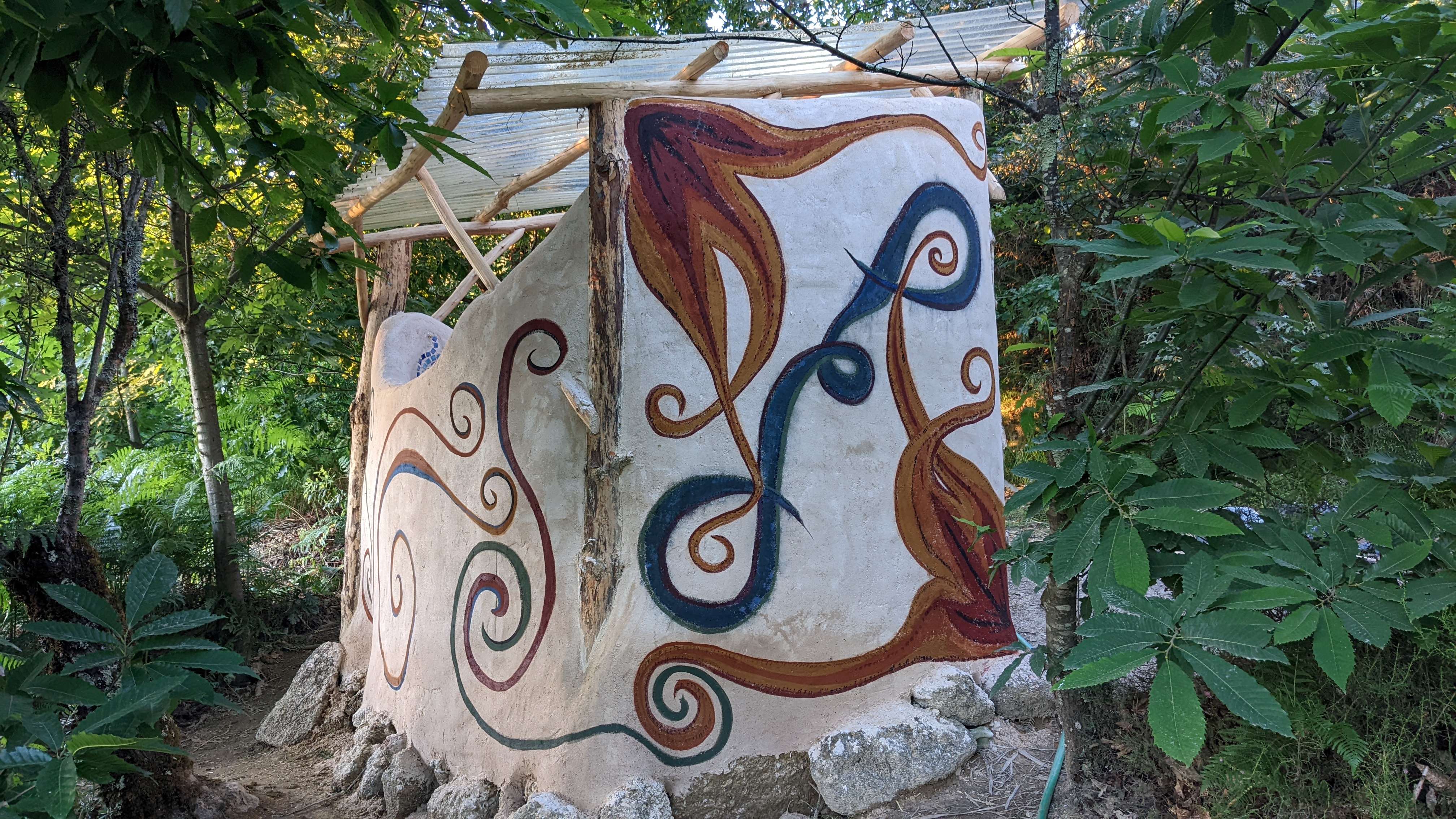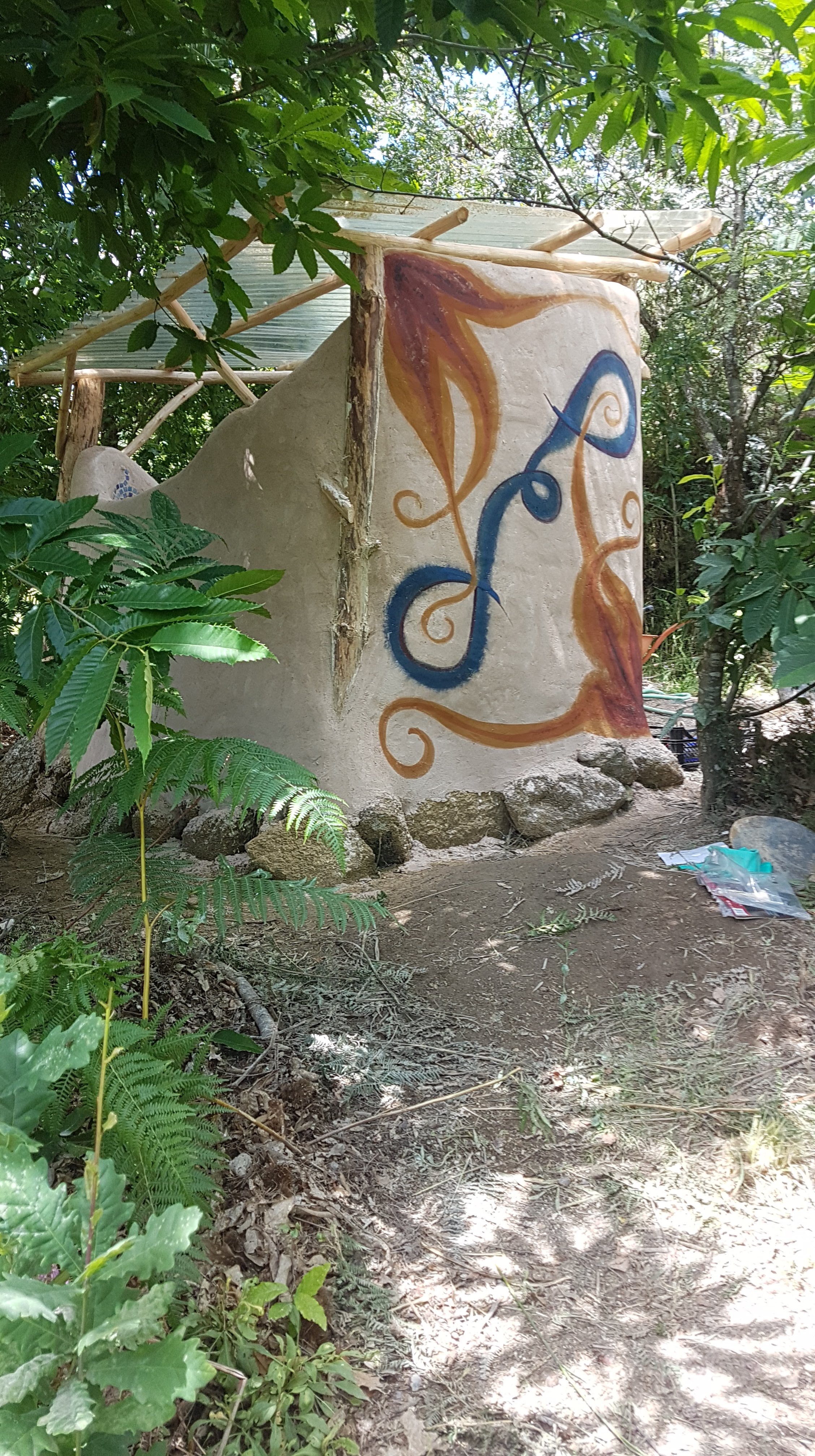 We decided to build a cob shower, in order to gain some experience with tadelakt water-resistant plaster. It is spiral-shaped, Fibonacci inspired.